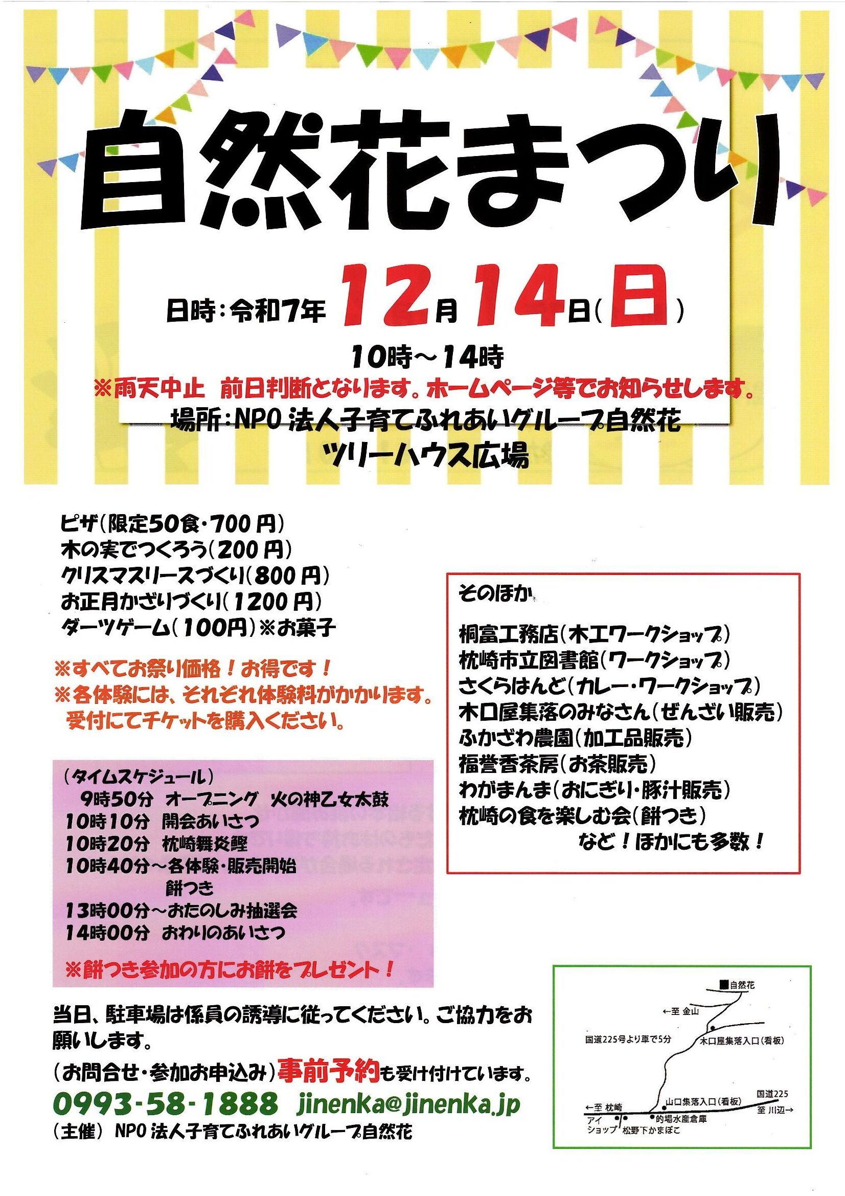 こんにちは!今日から12月ですね(^^)さて、自然花からイベントのお知らせです。12月14日(日)10時から14時「自然花まつり」を開催します。場所は、ツリーハウス広場です。自然花の体験で人気のピザ焼き体験をはじめ、工作体験や餅つき等、親子で楽しめる企画がもりだくさんです!