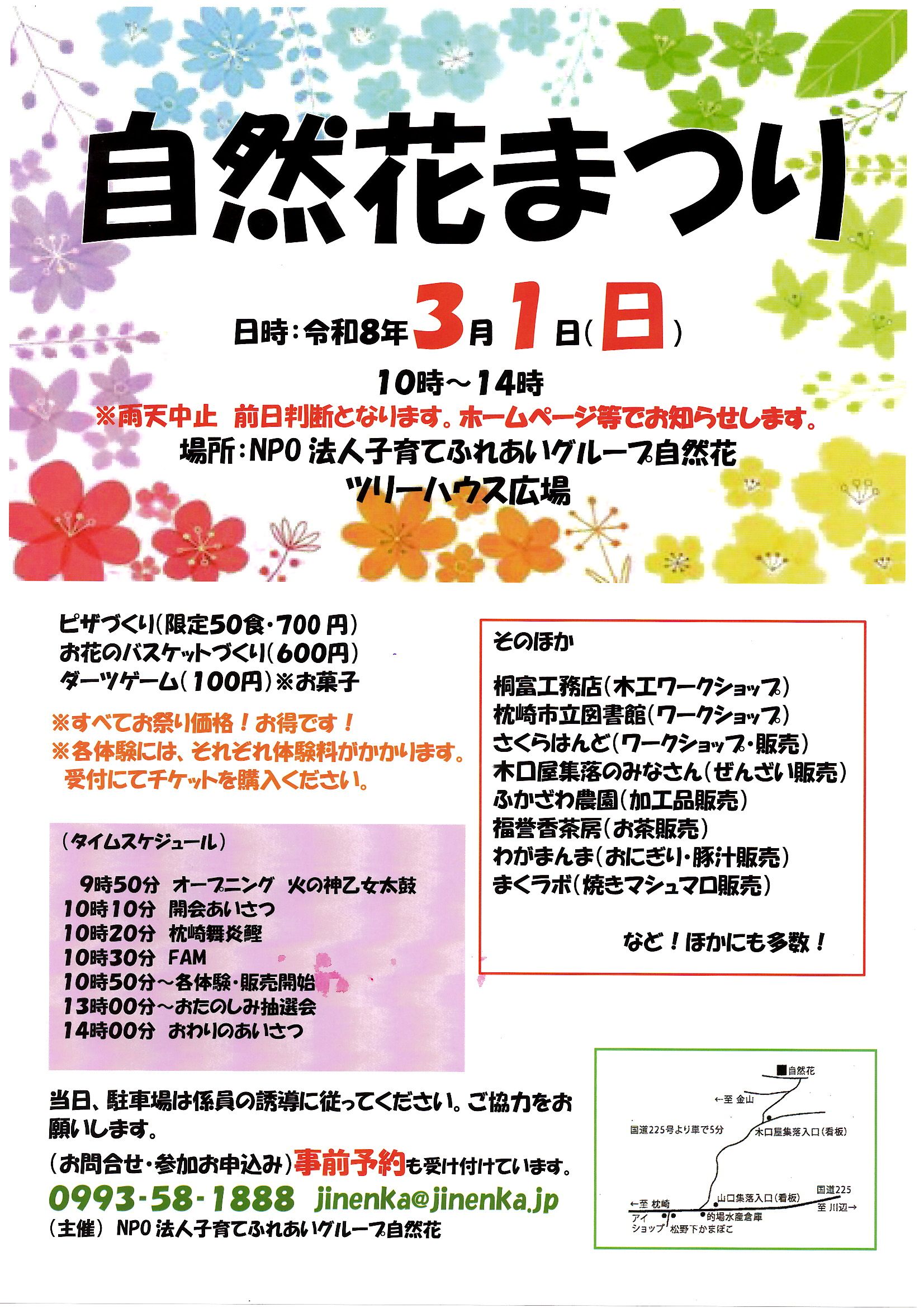 んにちは!自然花からのお知らせです。昨年12月に開催を予定していて悪天候のために延期となっていた「自然花まつり」を3月1日(日)10時~14時に行います!場所は、ツリーハウス広場です。自然花の体験で人気のピザ焼き体験や工作のワークショップなど、親子で楽しめる企画が盛りだくさんです!