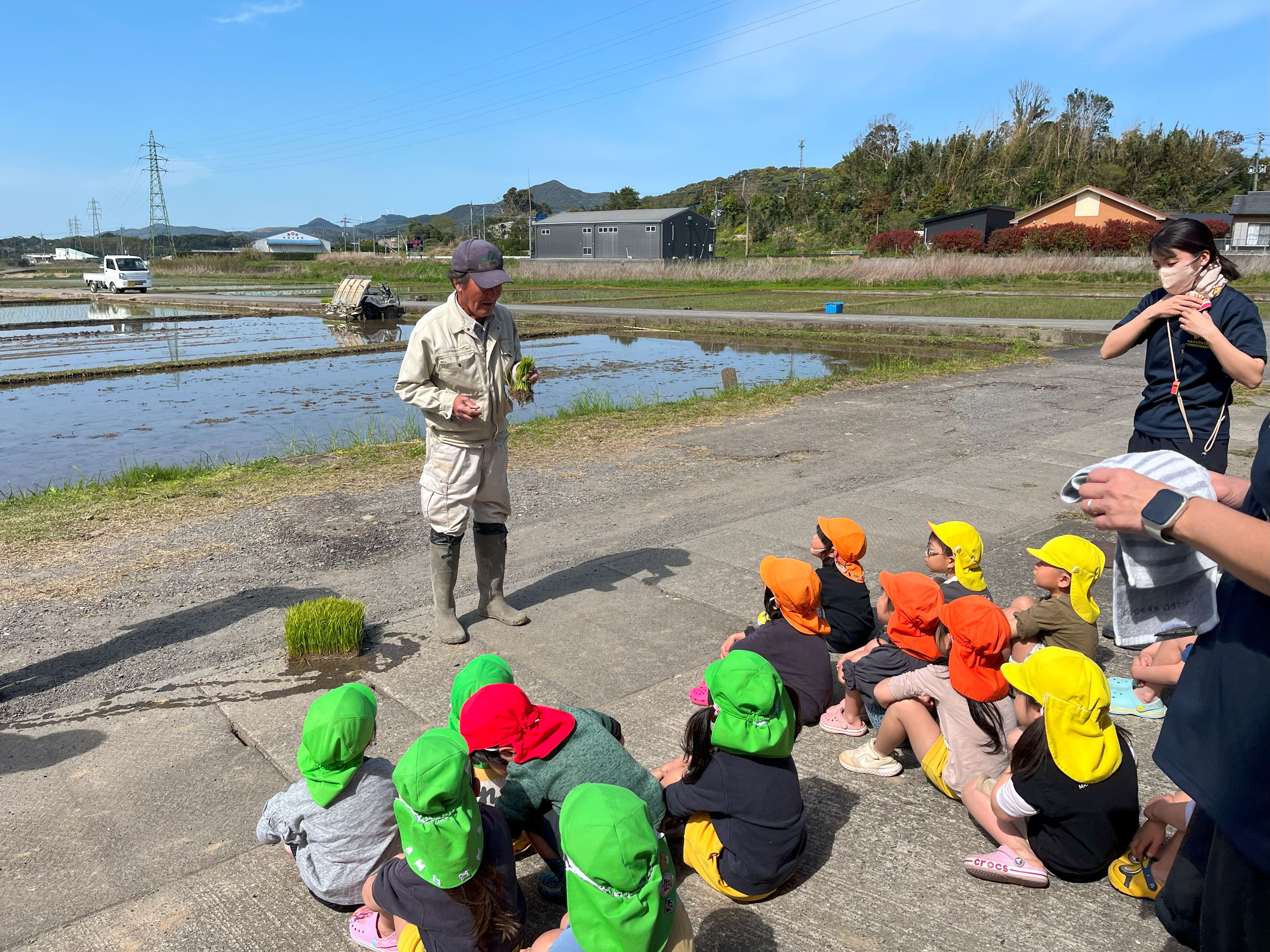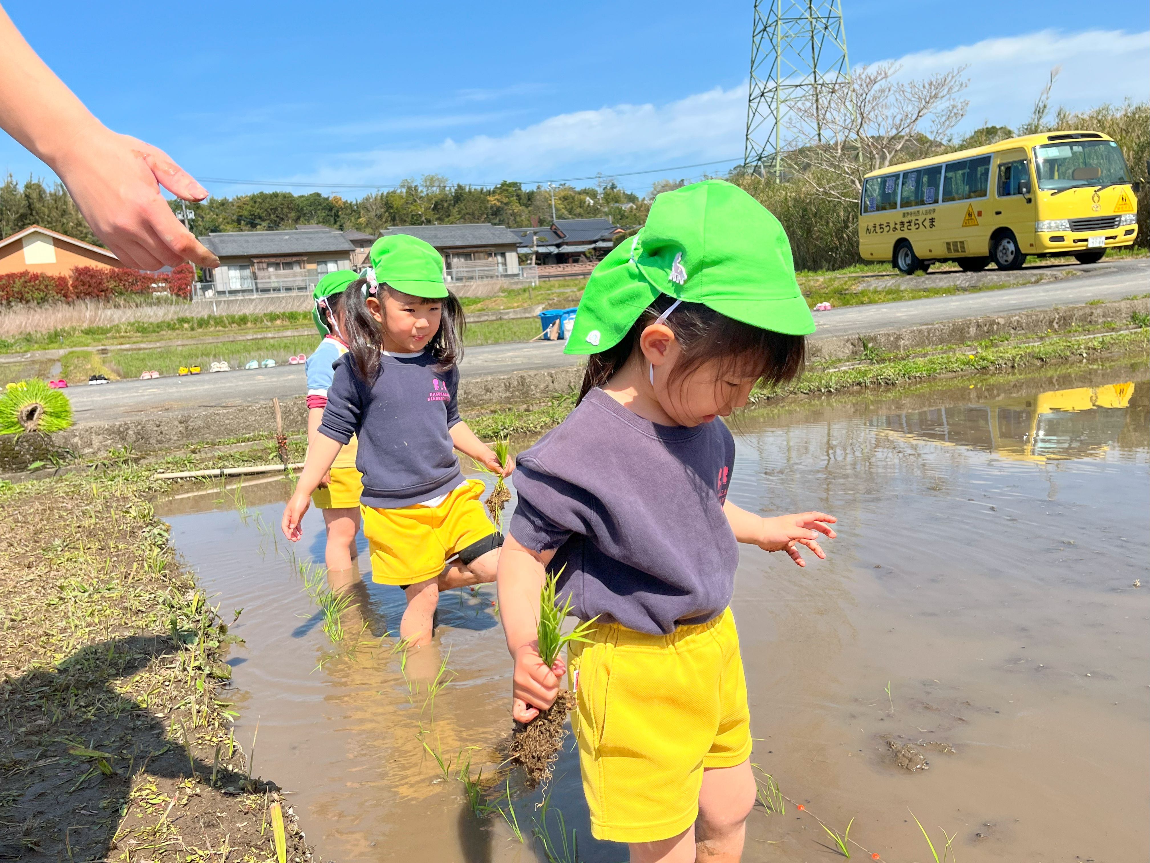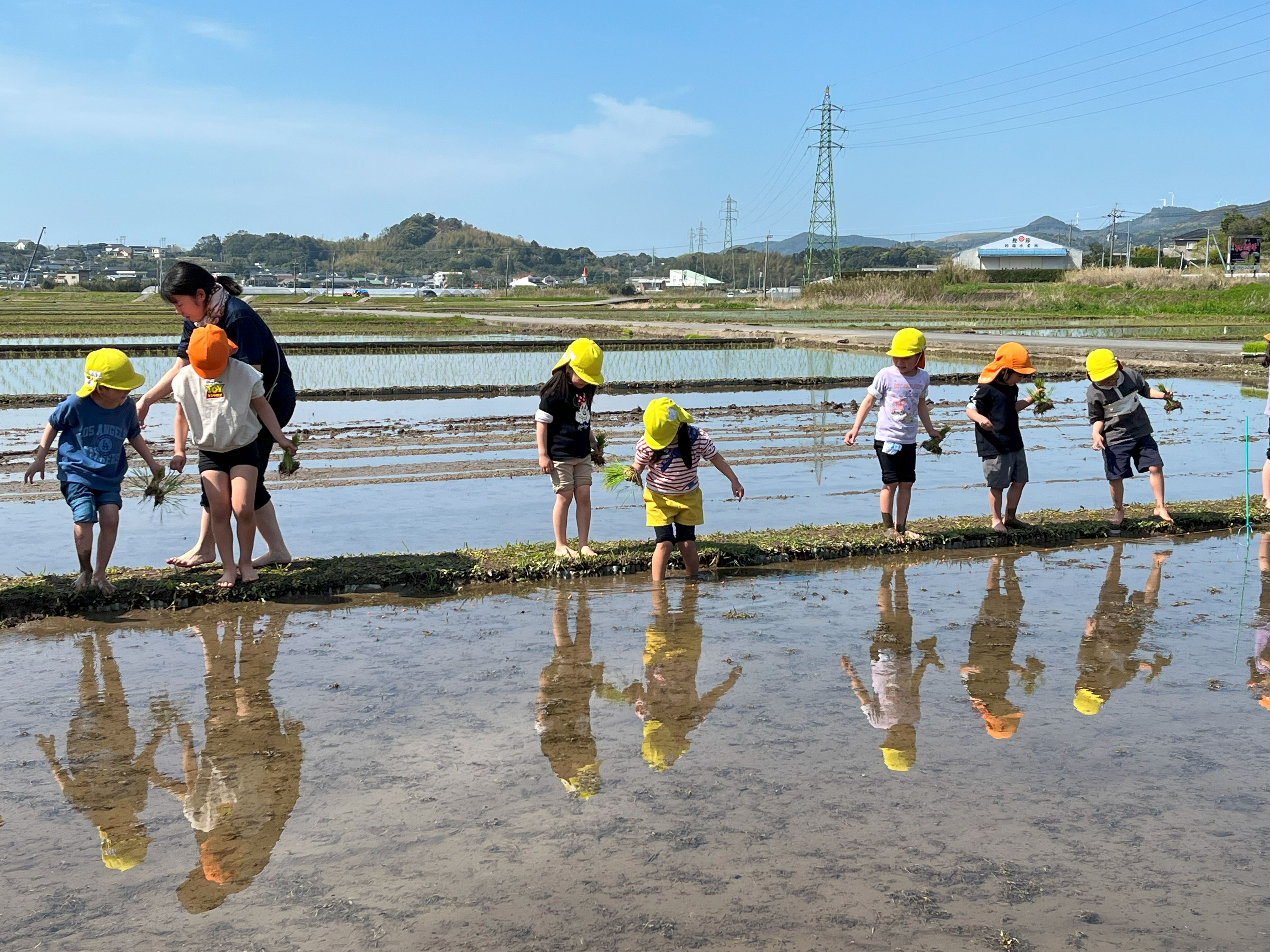 4月8日(火)、枕崎幼稚園の年長さんと年中さんが田植えの体験を行いました。