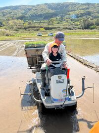 田んぼの土の感触を楽しみながら、みんな笑顔で田んぼに入りました。苗を自分たちで手植えした後は、田植え機にも乗せてもらいました。