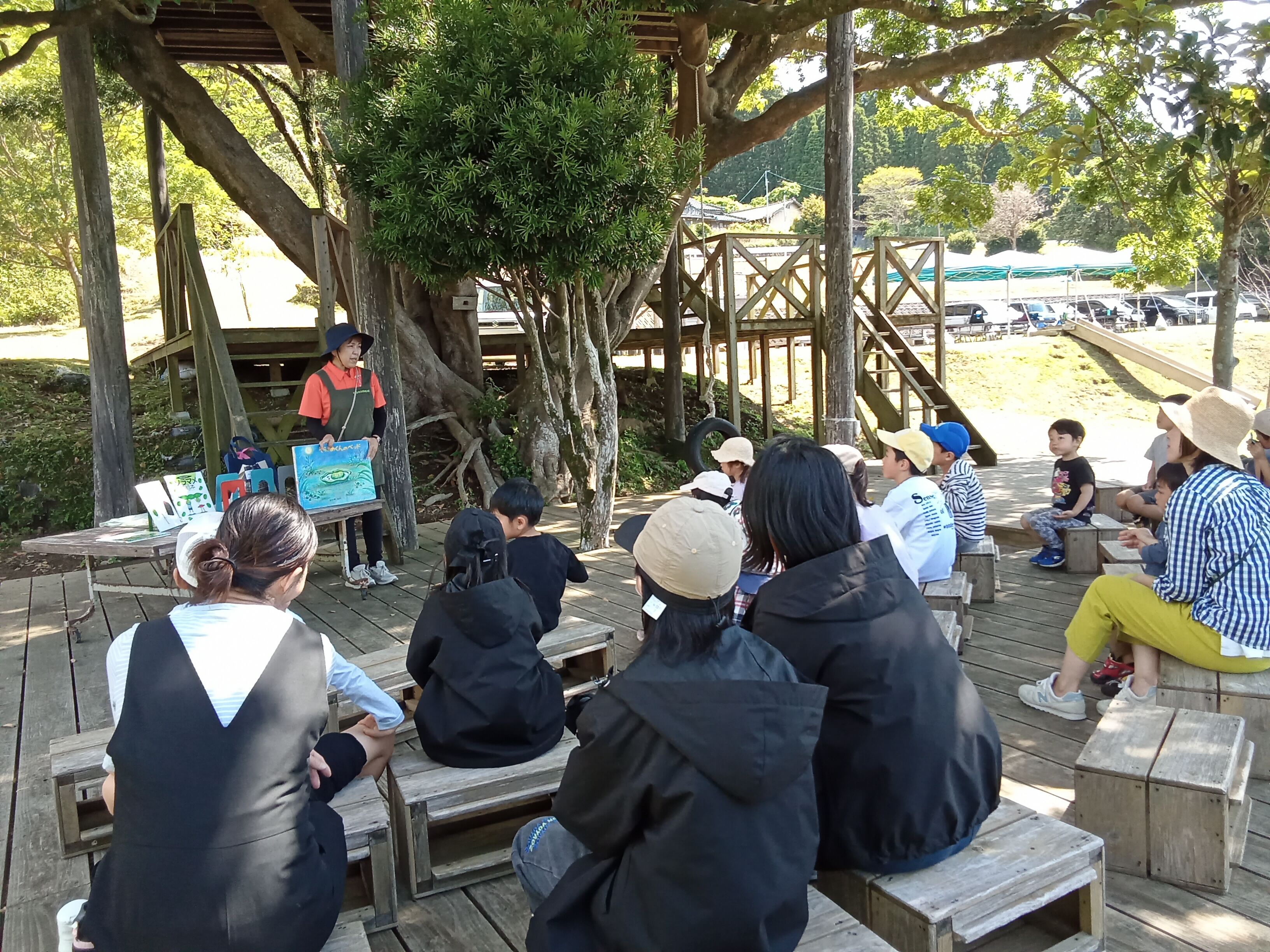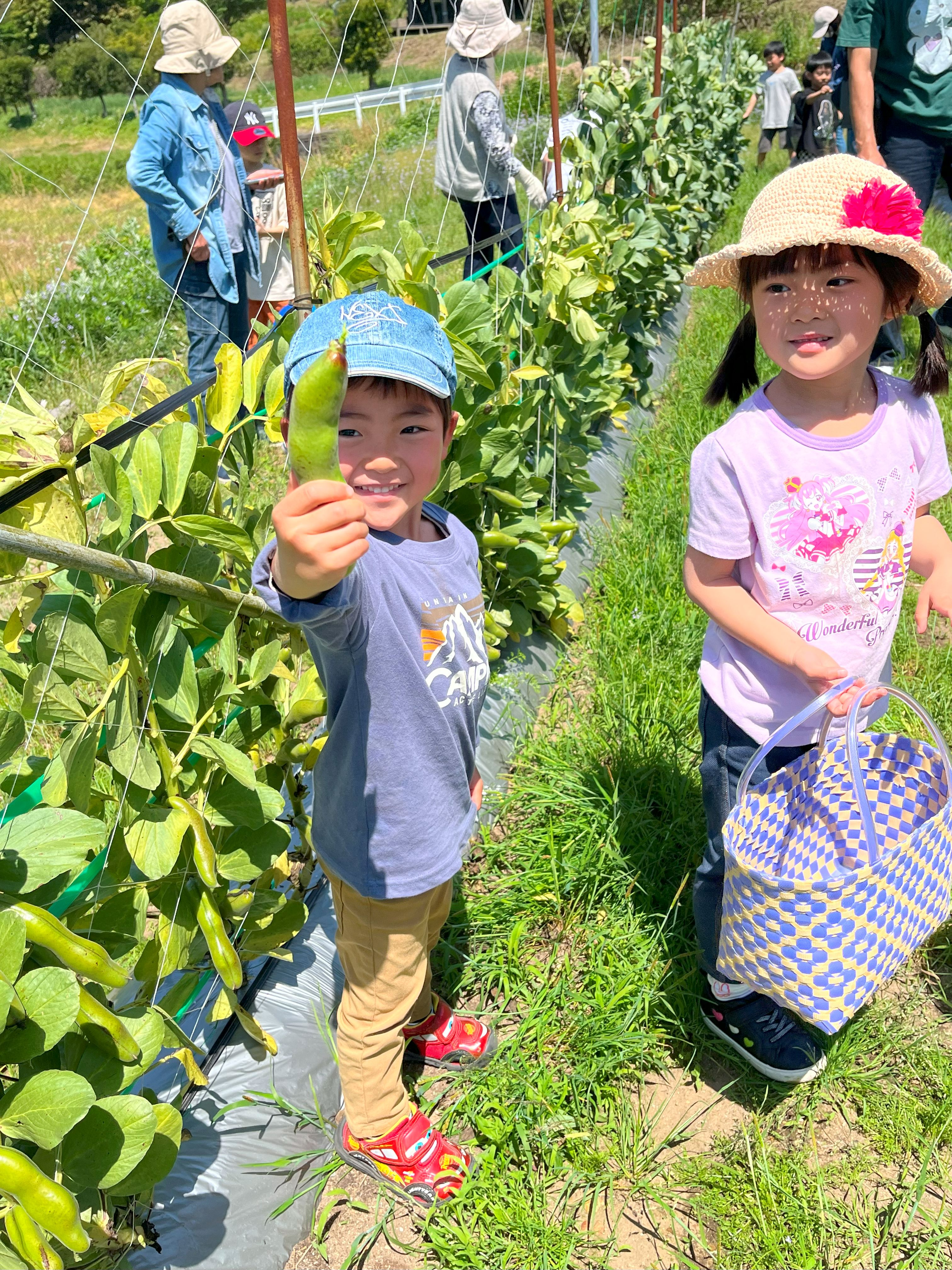 そら豆の登場する絵本の読み聞かせ、そら豆と新玉ねぎの収穫体験、木の実工作など盛りだくさんの体験となりました。