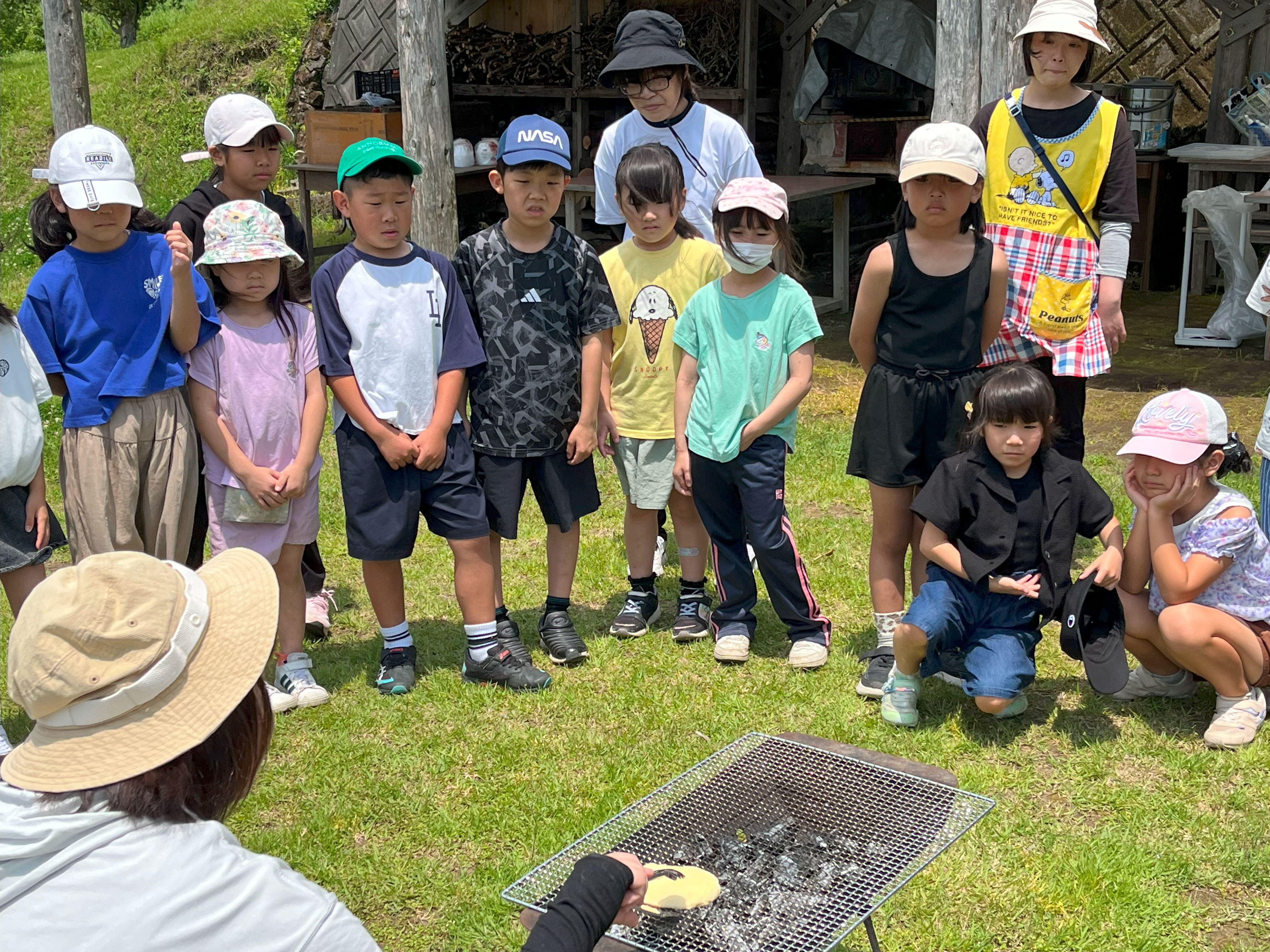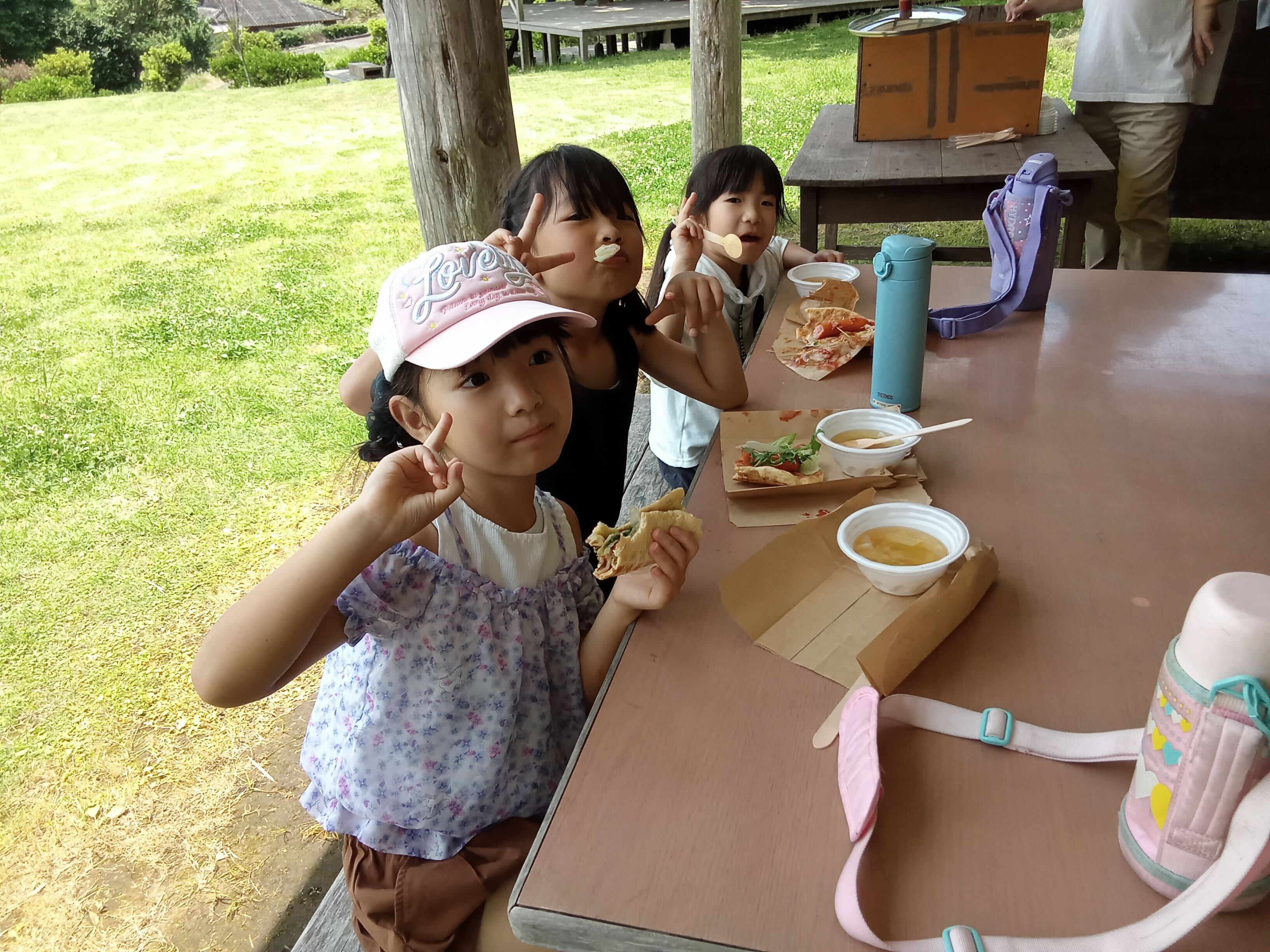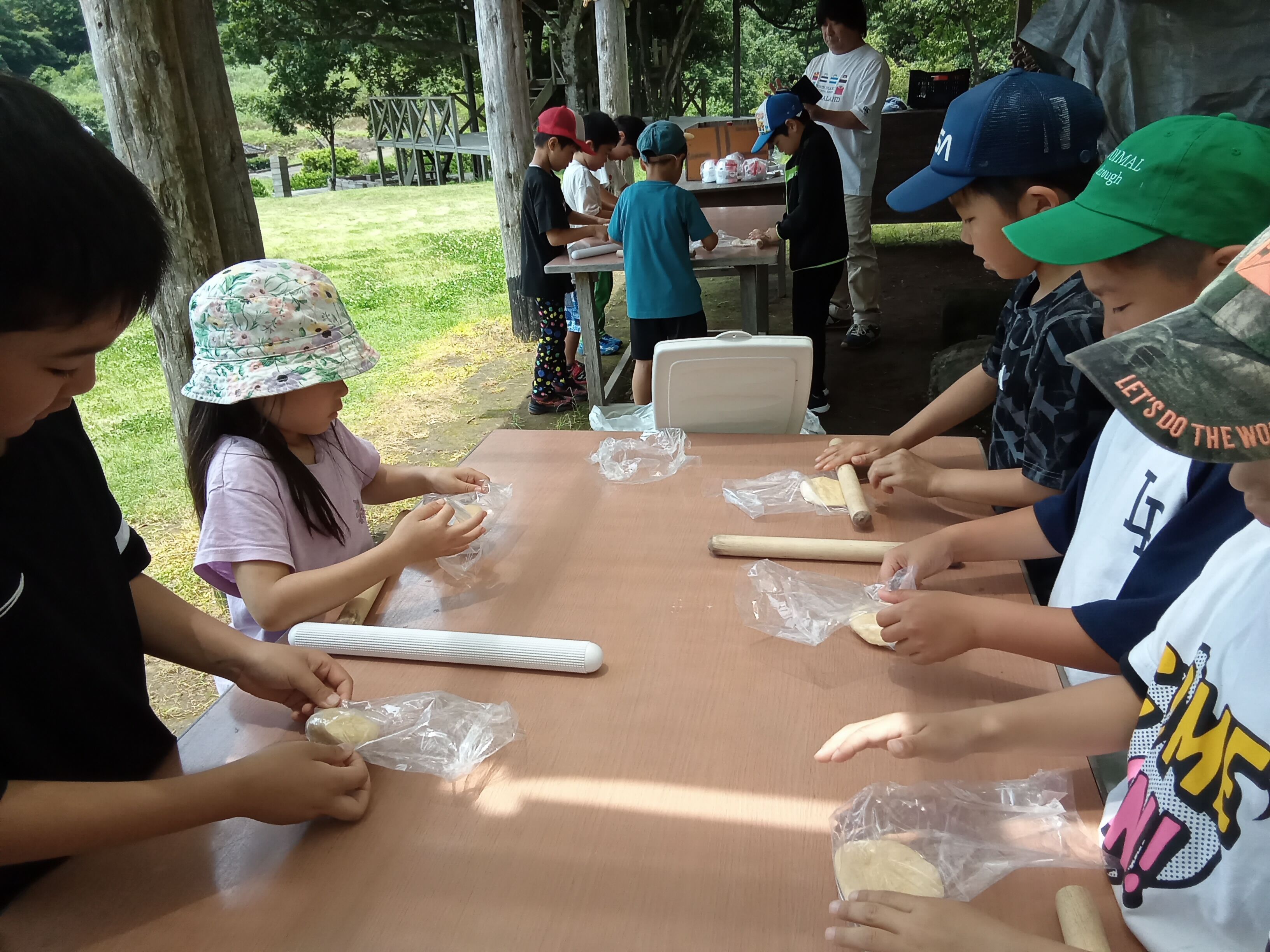 昼食は、パン生地をのばして炭火で焼いて野菜やウインナーをトッピングしたパンドッグ!焼くのが少し難しかったですが(これからもう少しやり方を改善します)、コンソメスープと美味しく食べました(^^)