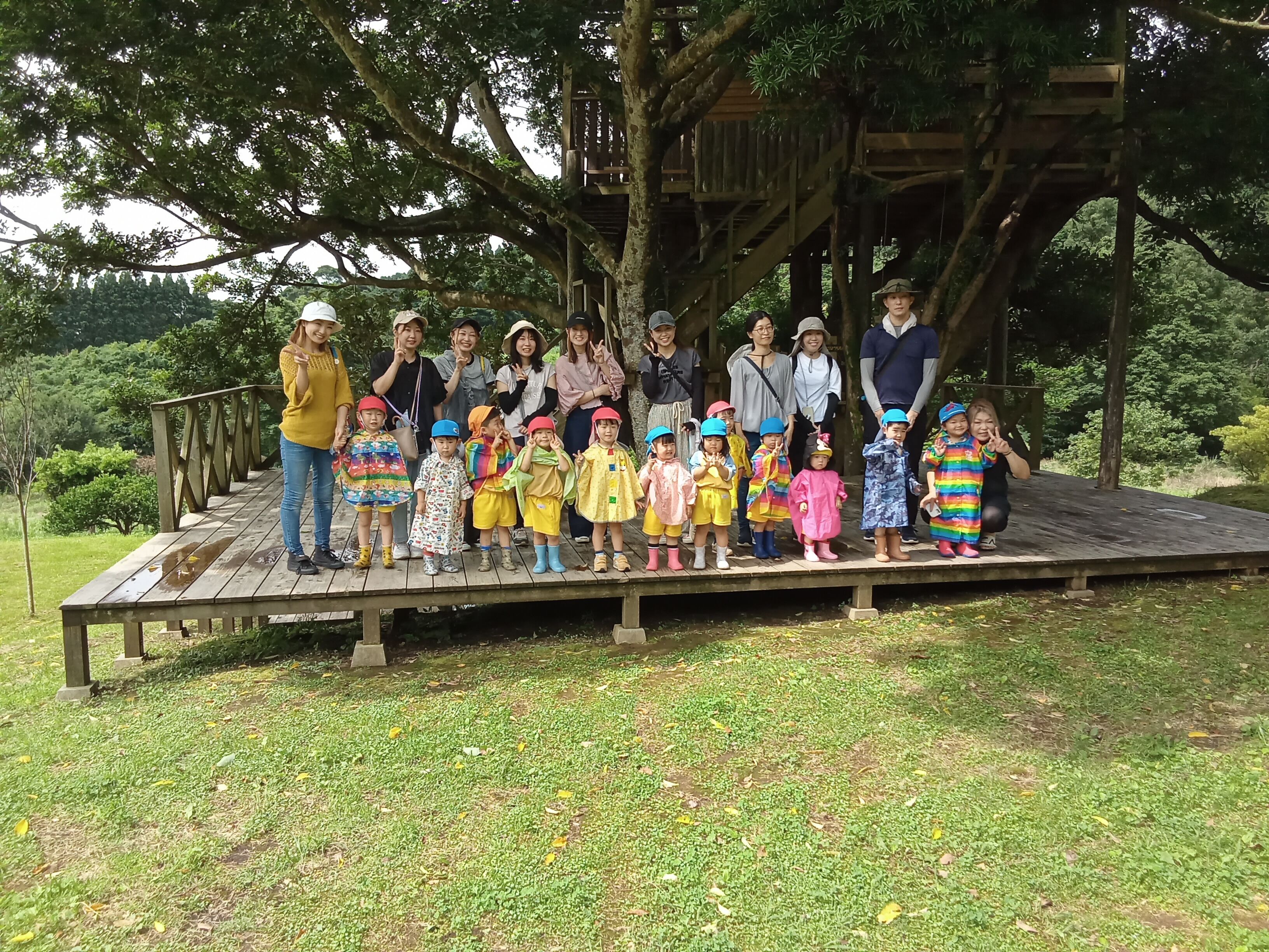 当日は、雨は降らず、じめじめムシムシするお天気(><)せっかく持ってきたカッパは最初に着てみんなで写真を撮りました(^^)