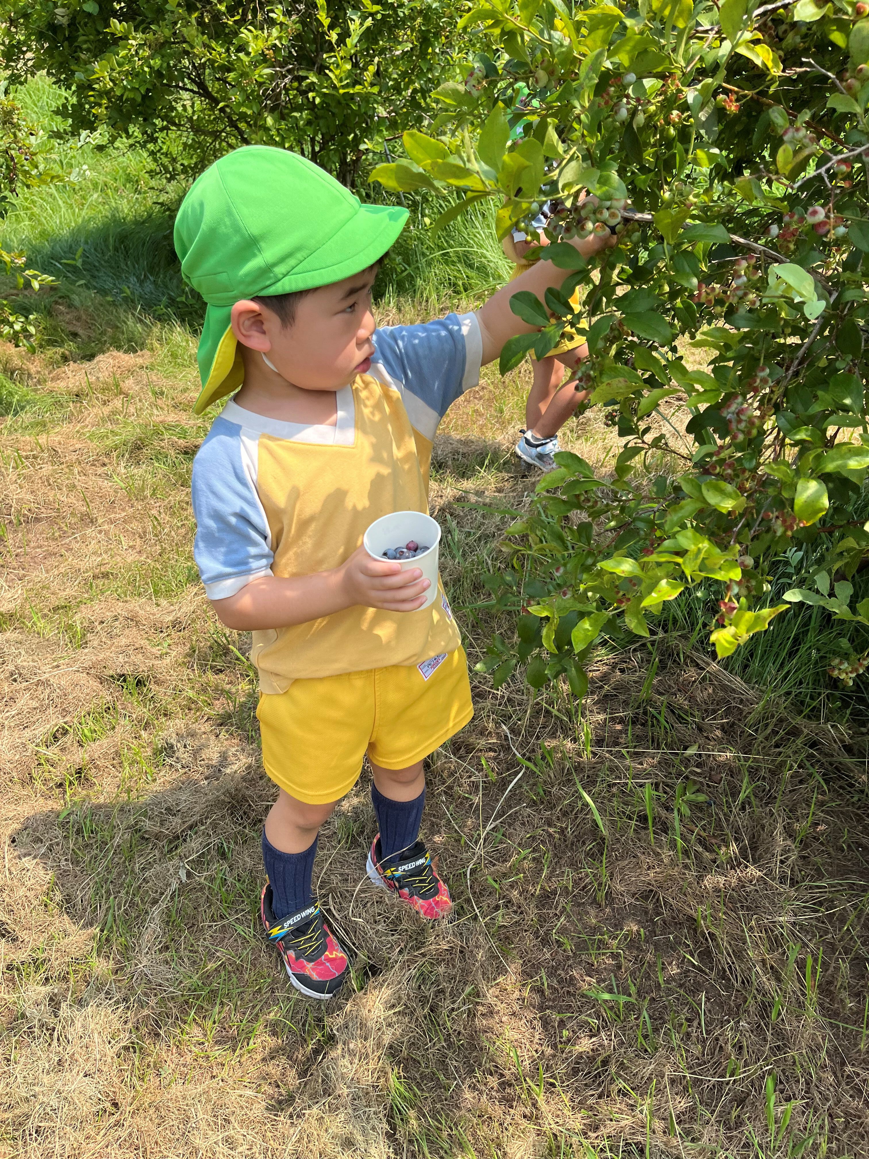 ピーマン、ナス、ミニトマトを収穫しました。広場に植えているブルーベリーもカップいっぱいにそれぞれで収穫しました。ブルーベリーは、今が旬です。甘酸っぱい実を収穫しながらお口にパクッ!