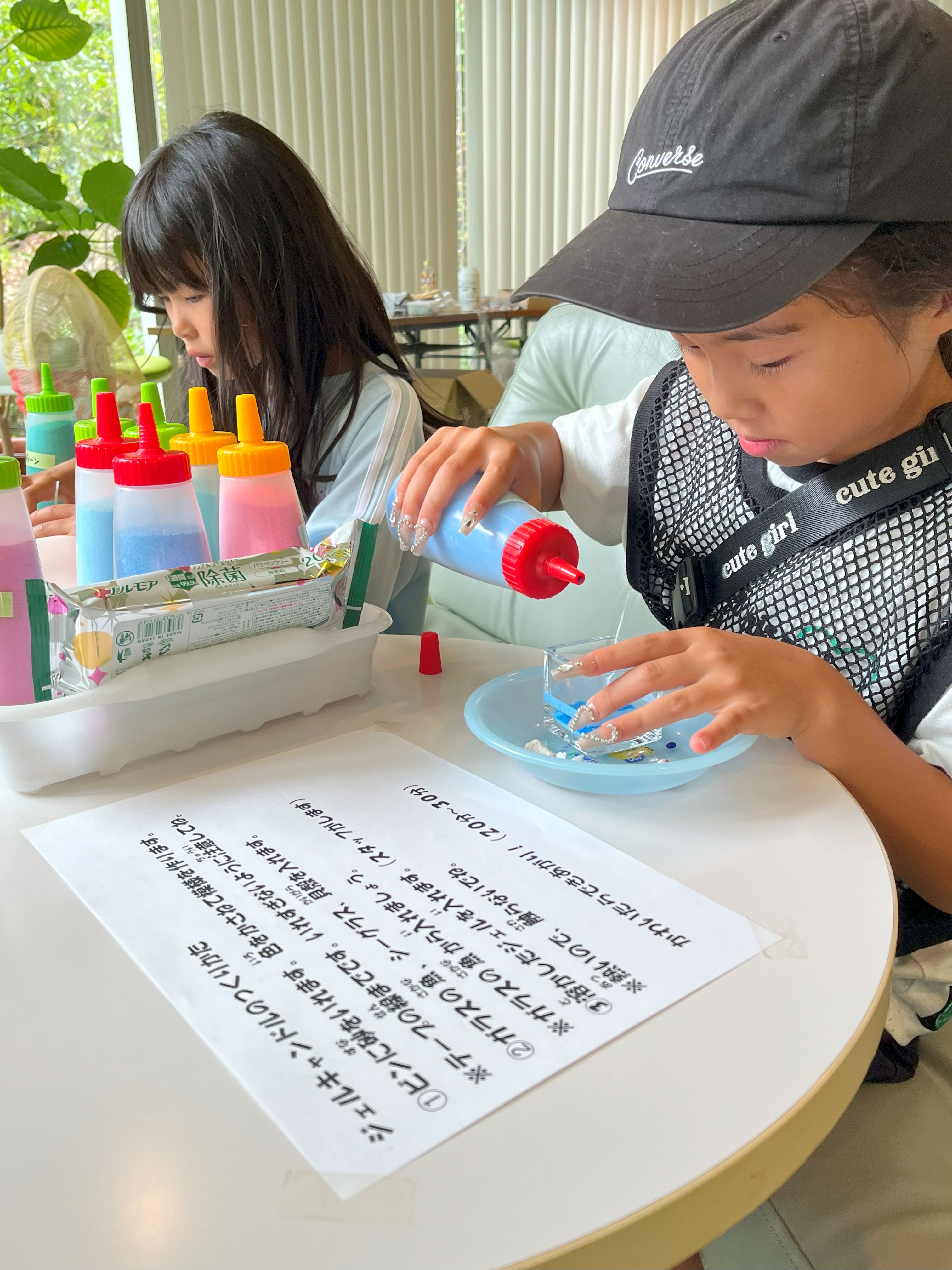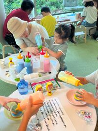 夏の工作として、ジェルキャンドルづくり、カラーサンドアート、夏の時計の3種類の工作を準備しました。1日を通して80名を超える親子に工作をしていただきました(^^)みんなとってもかわいい夏の作品が出来上がっていました。