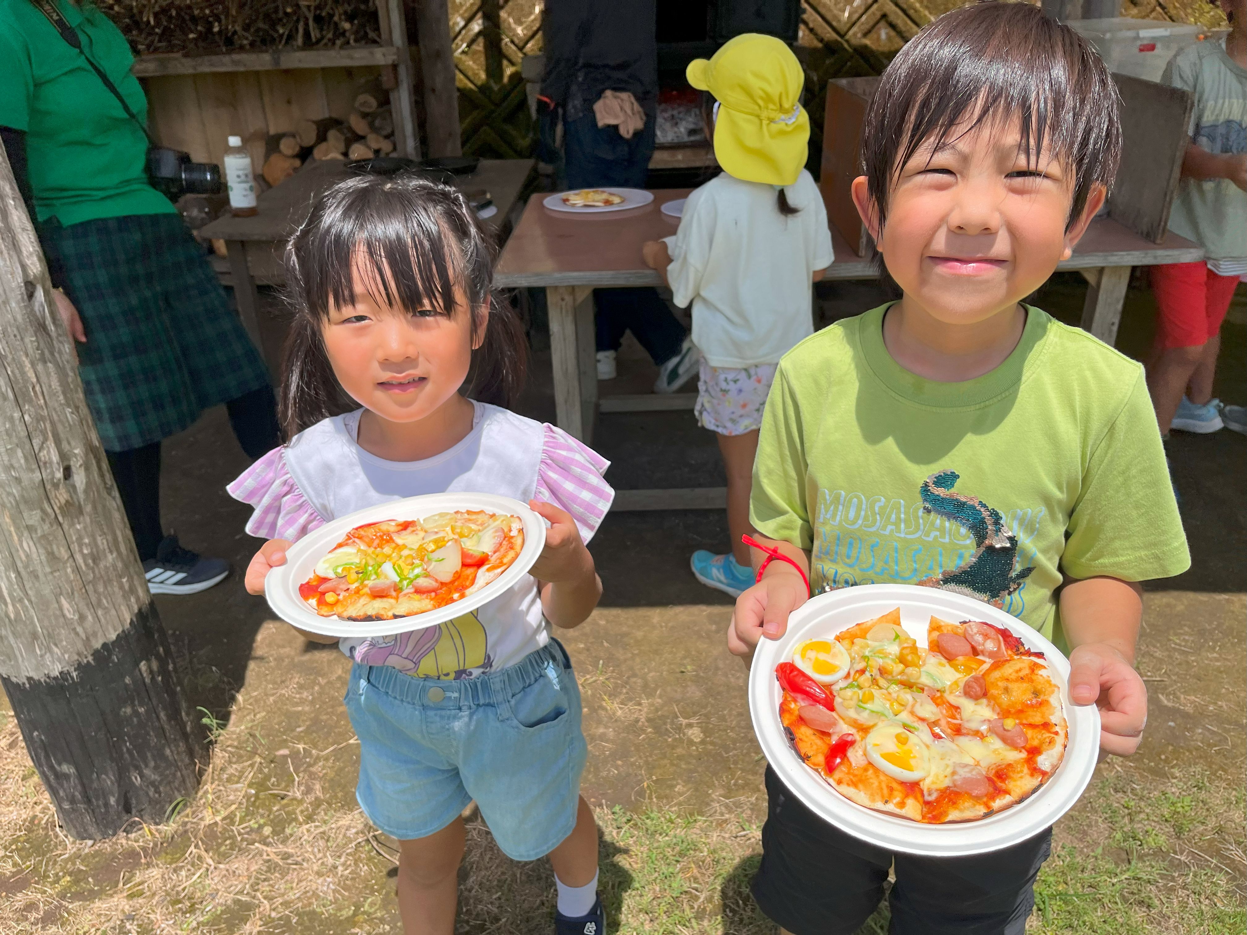 虫捕りや広場遊び、昼食のピザ焼き体験、川遊びをしました。
