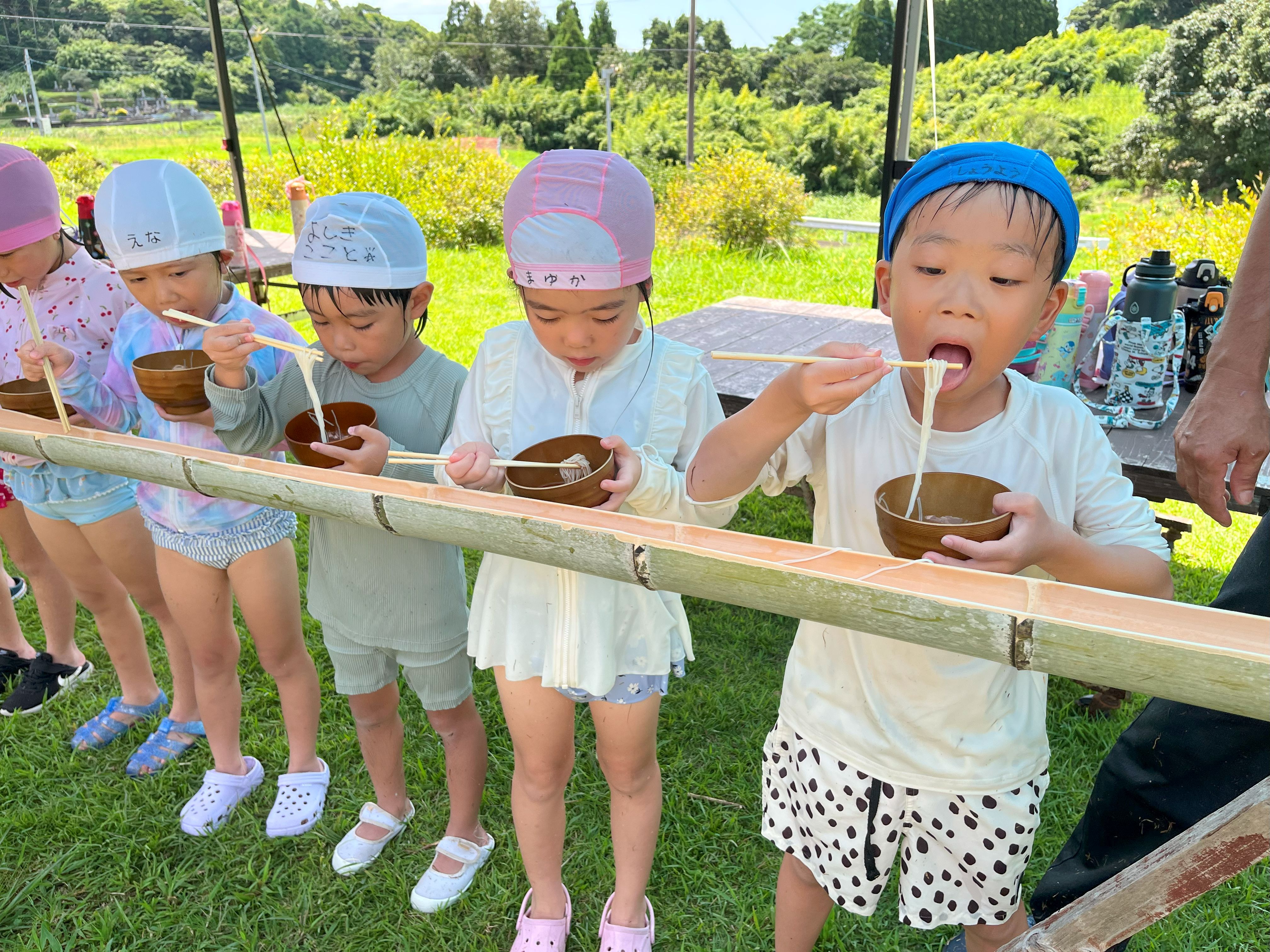 水遊びの後は、そうめん流しをしました!先日収穫したお米を炊いたおにぎりも一緒に食べました。水遊びでたっぷり遊んだみんなは、お腹がペコペコ。たくさん湯がいたそうめんもおにぎりもきれいに食べてくれました!