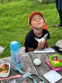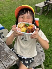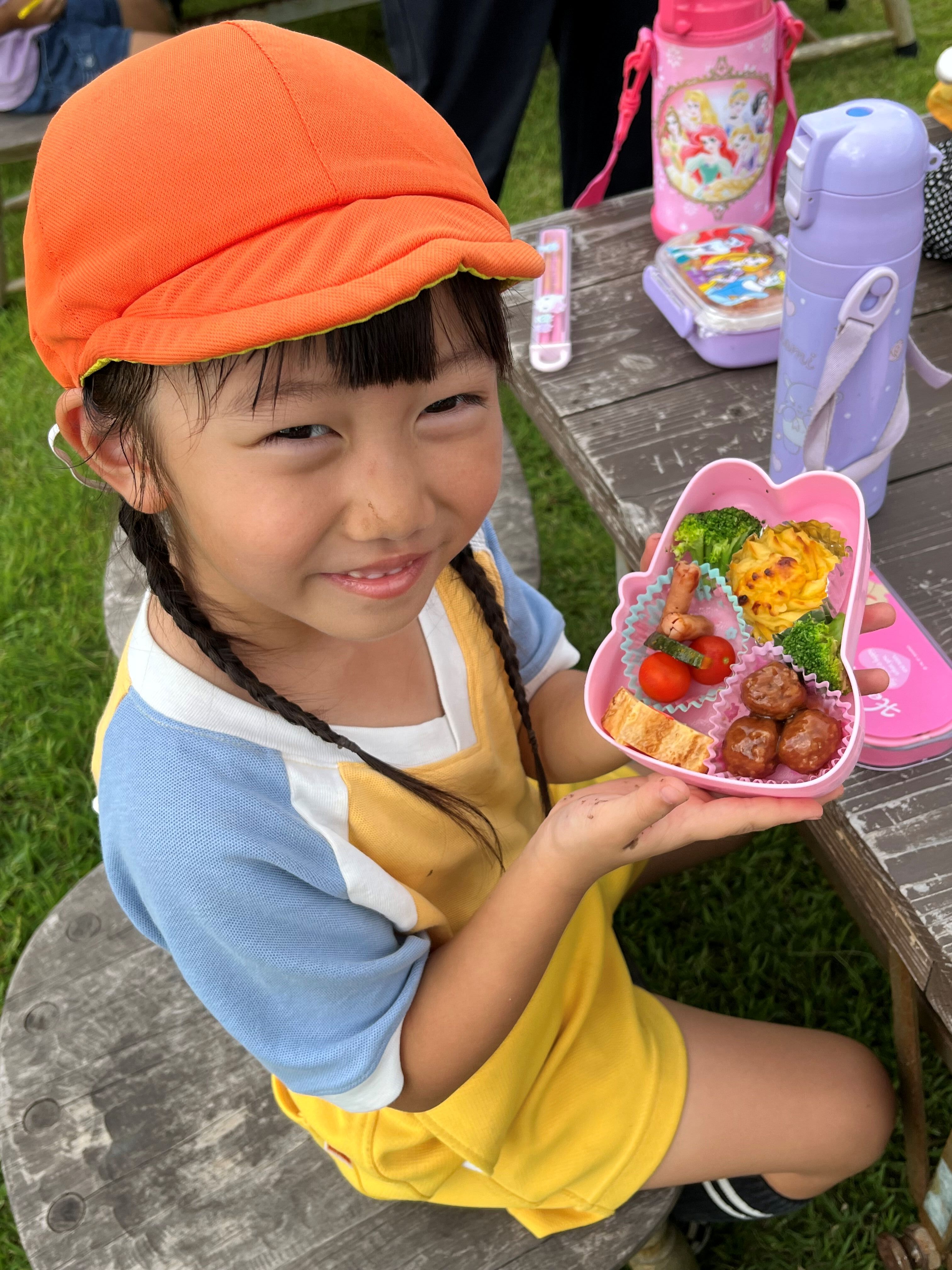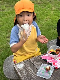 ラップで上手に包んで自分で食べるおにぎりをそれぞれ作りました。おにぎりとお家から持ってきたおかずと一緒に食べました!外でみんなと食べるご飯は美味しくて、おにぎりをおかわりした子もいました(^^)