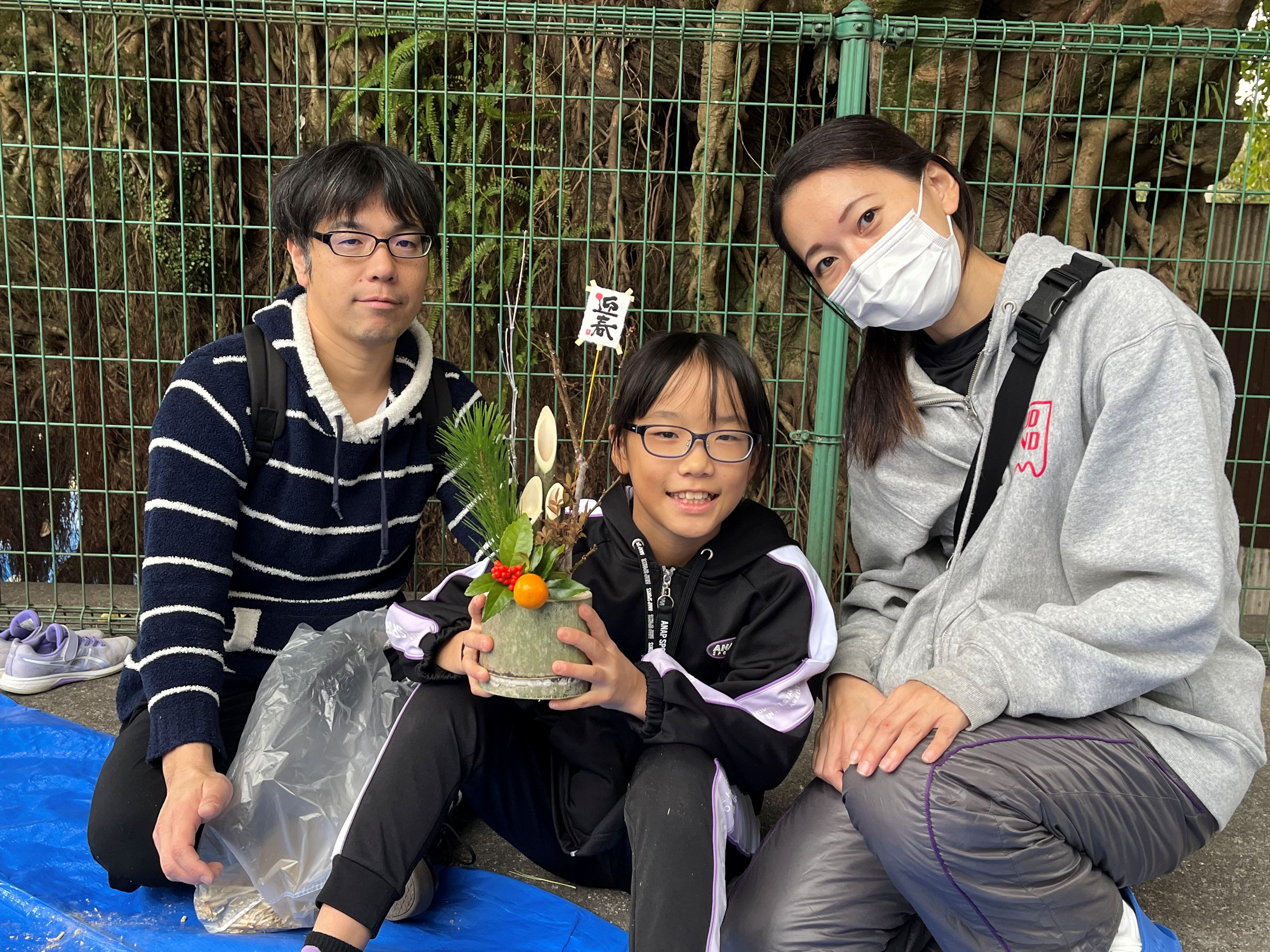 その後、家に飾るミニ門松を自然花スタッフと作りました。竹の器にワラを隙間なく入れて、はさみで高さをそろえる作業が難しかったですが、みんな素敵なミニ門松が出来上がりました!