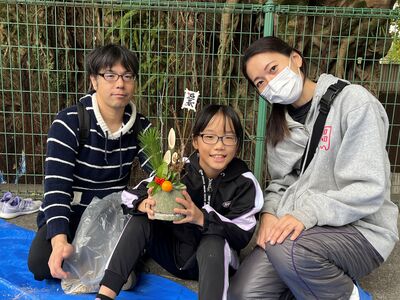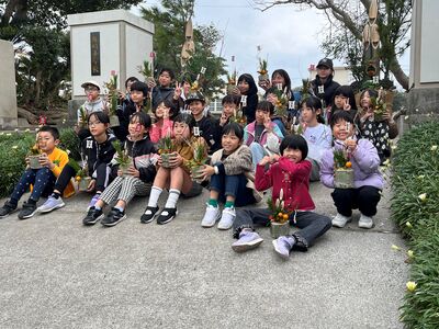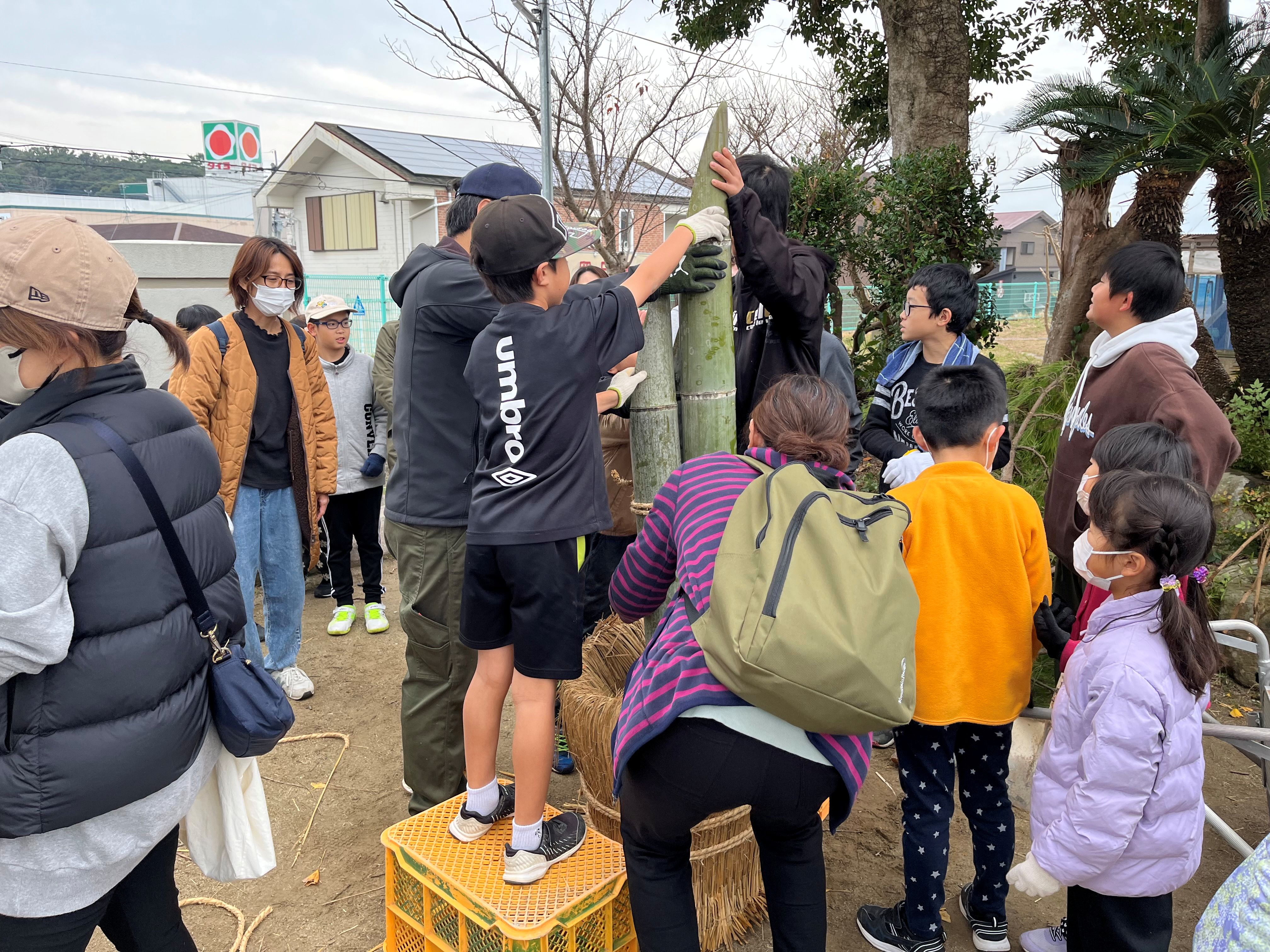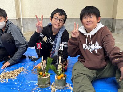 集まった子どもたちは、校門に飾る大きな門松をみんなで協力して作りました(^^)