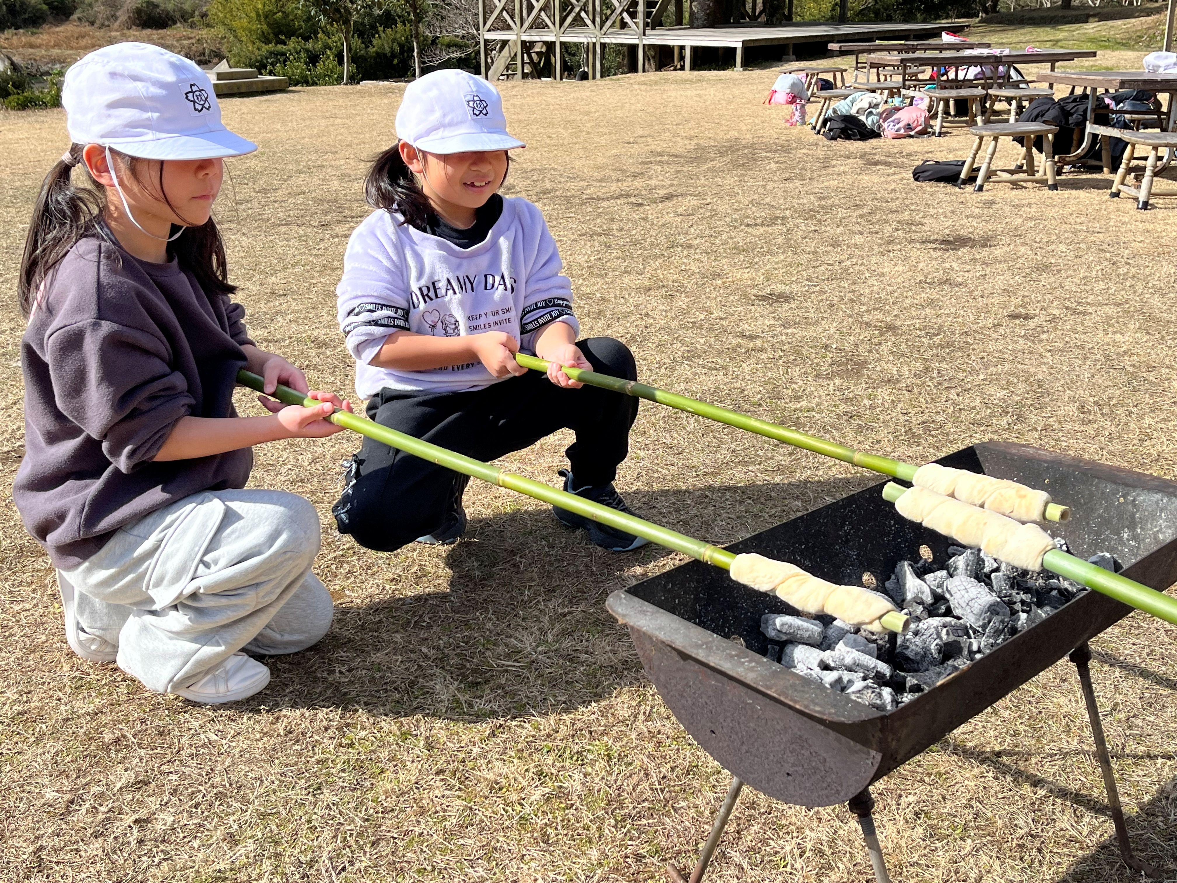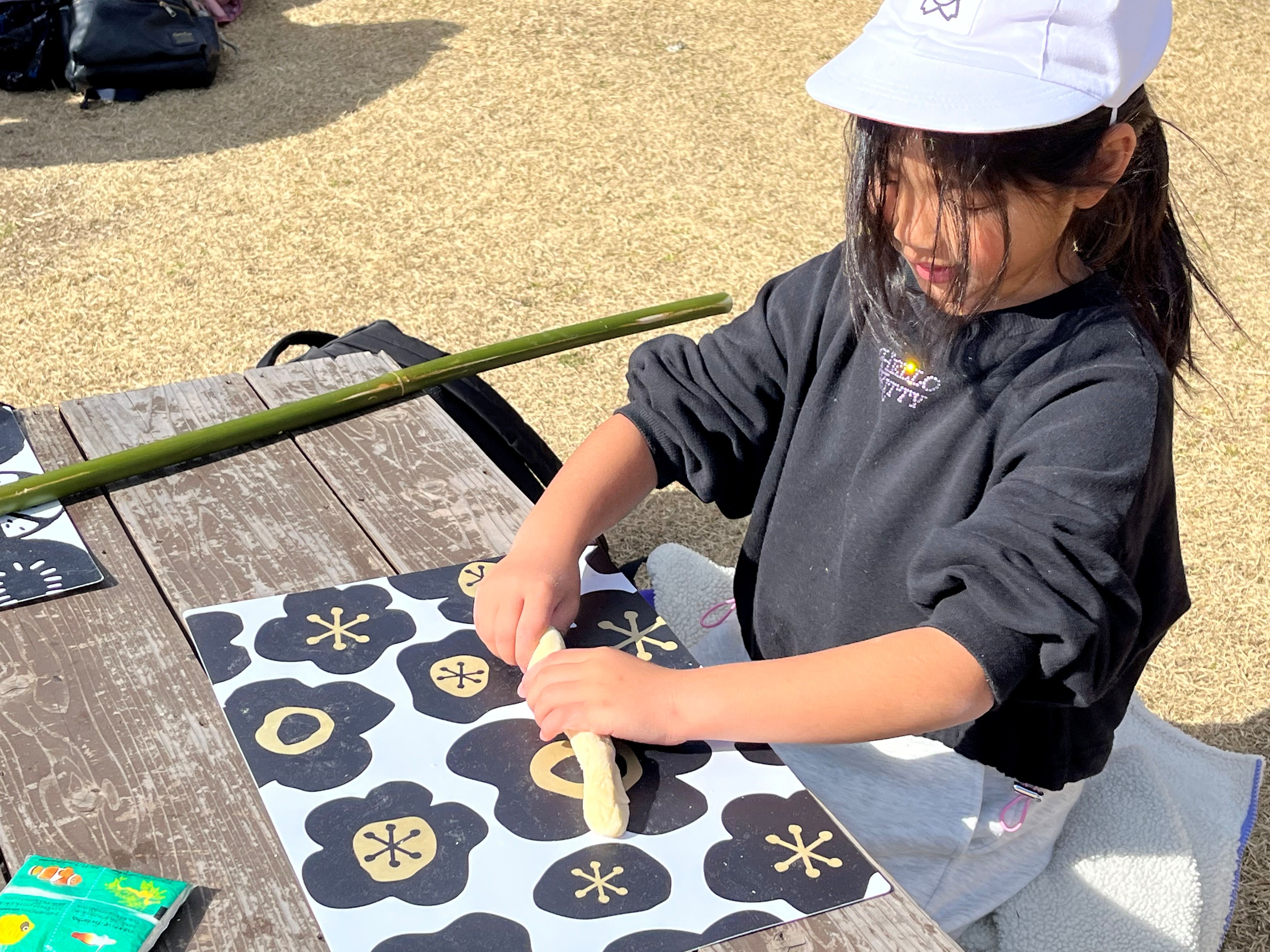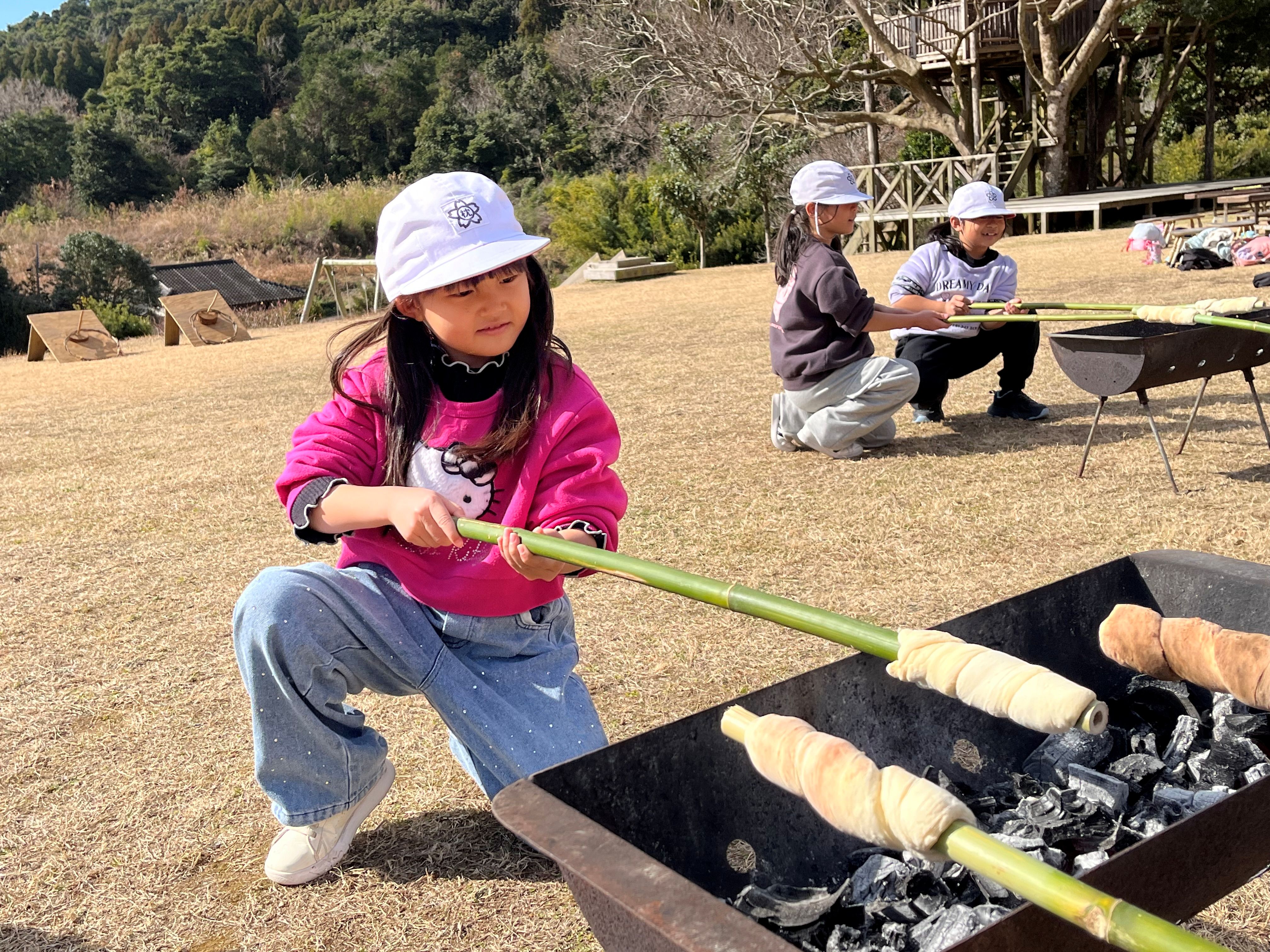 くるくるパン焼き体験では、それぞれ自分のパンを竹に巻き付けて焼きました。みんなで焼いたパンは、美味しかった!ようで「おかわりは?」の声も聞かれました(^^)