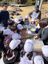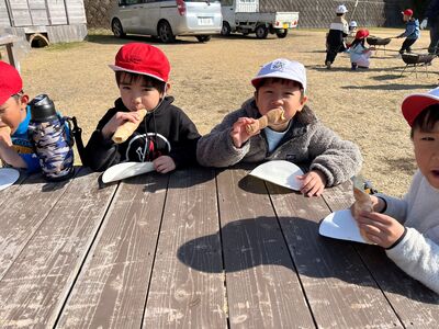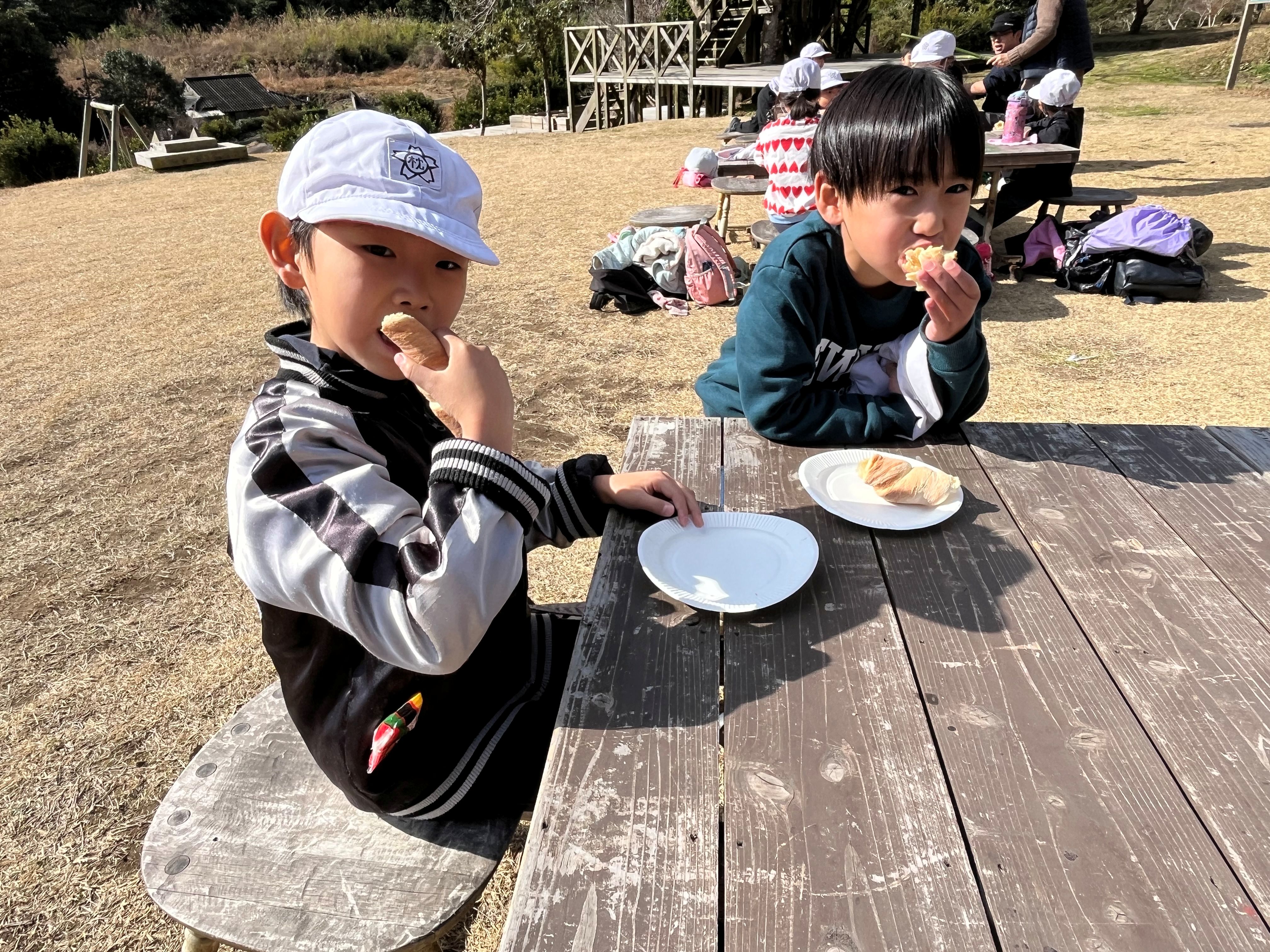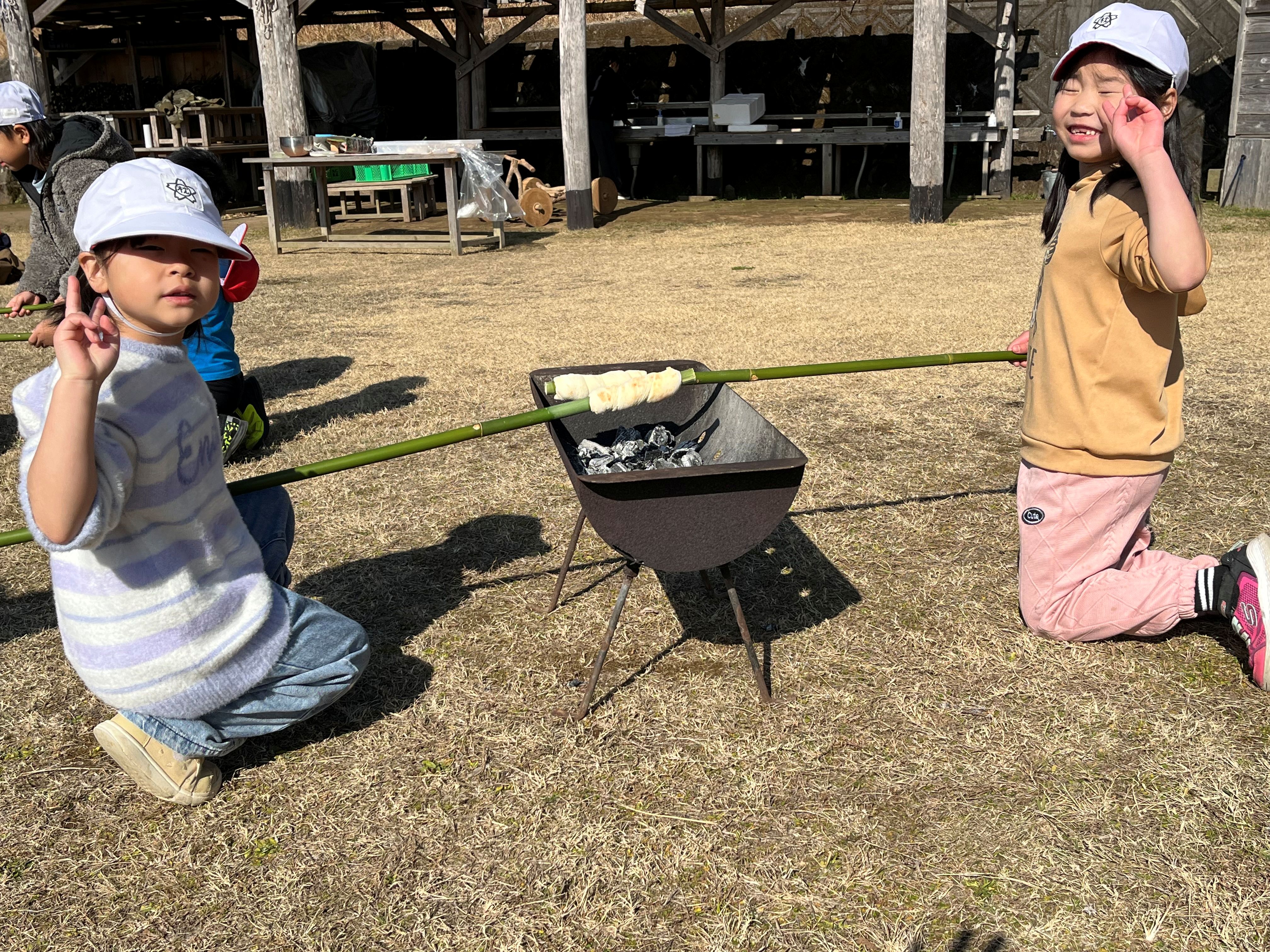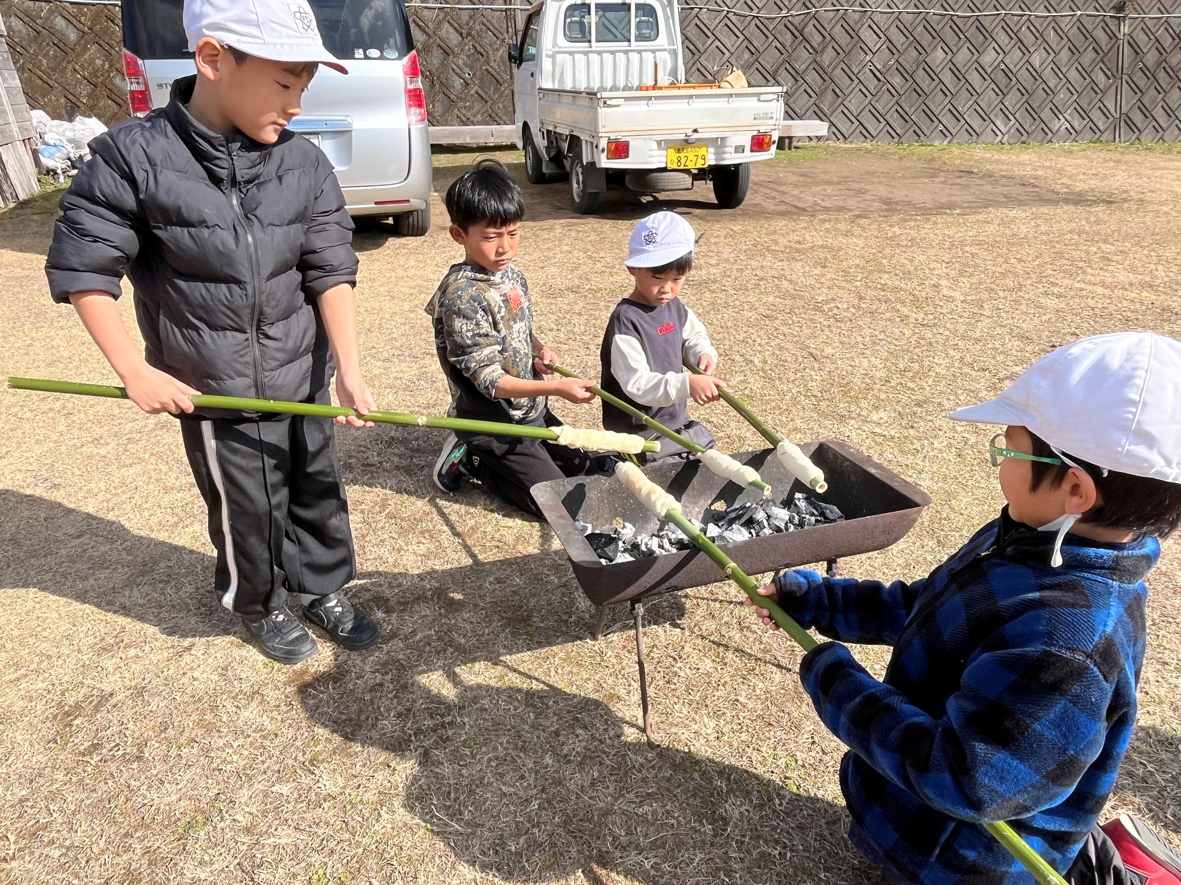 くるくるパン焼き体験では、それぞれ自分のパンを竹に巻き付けて焼きました。みんなで焼いたパンは、美味しかった!ようで「おかわりは?」の声も聞かれました(^^)