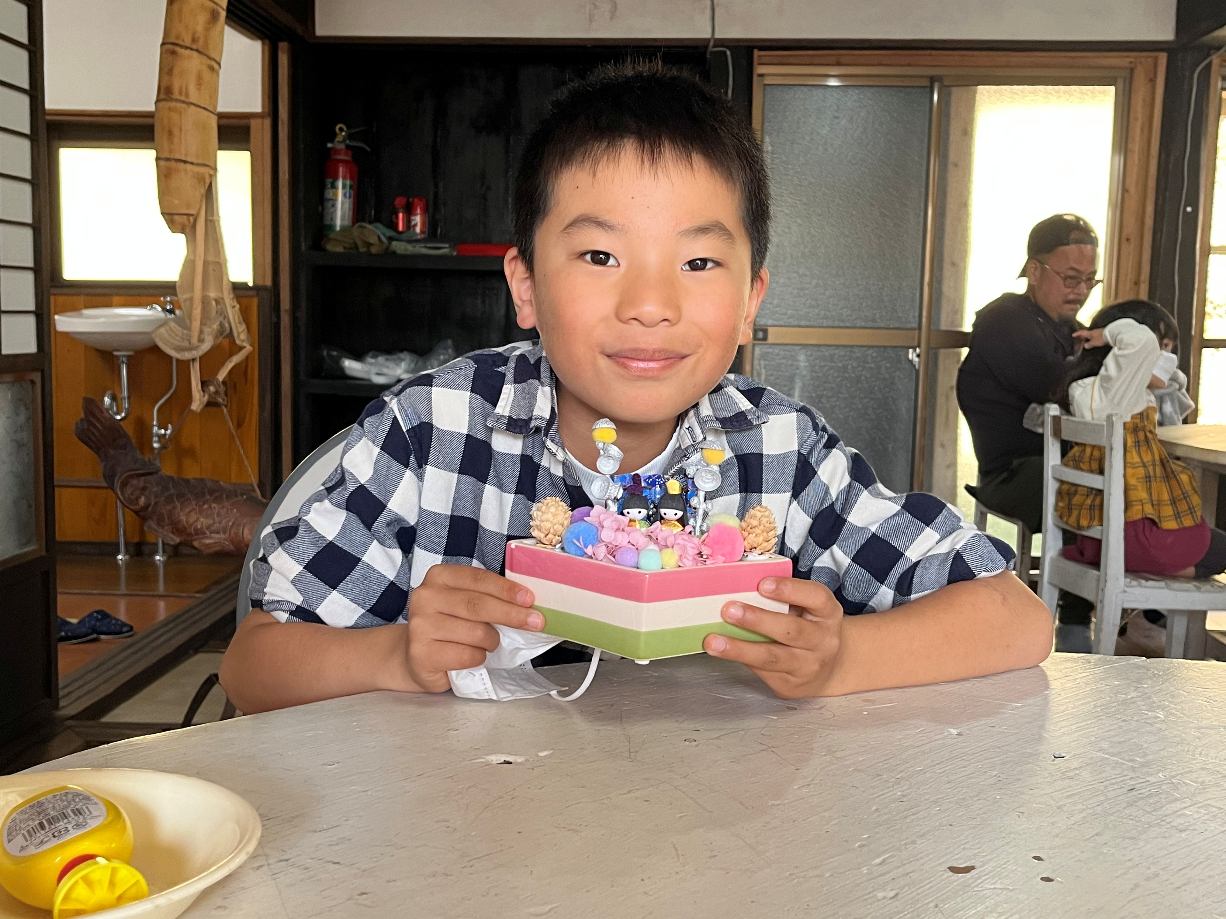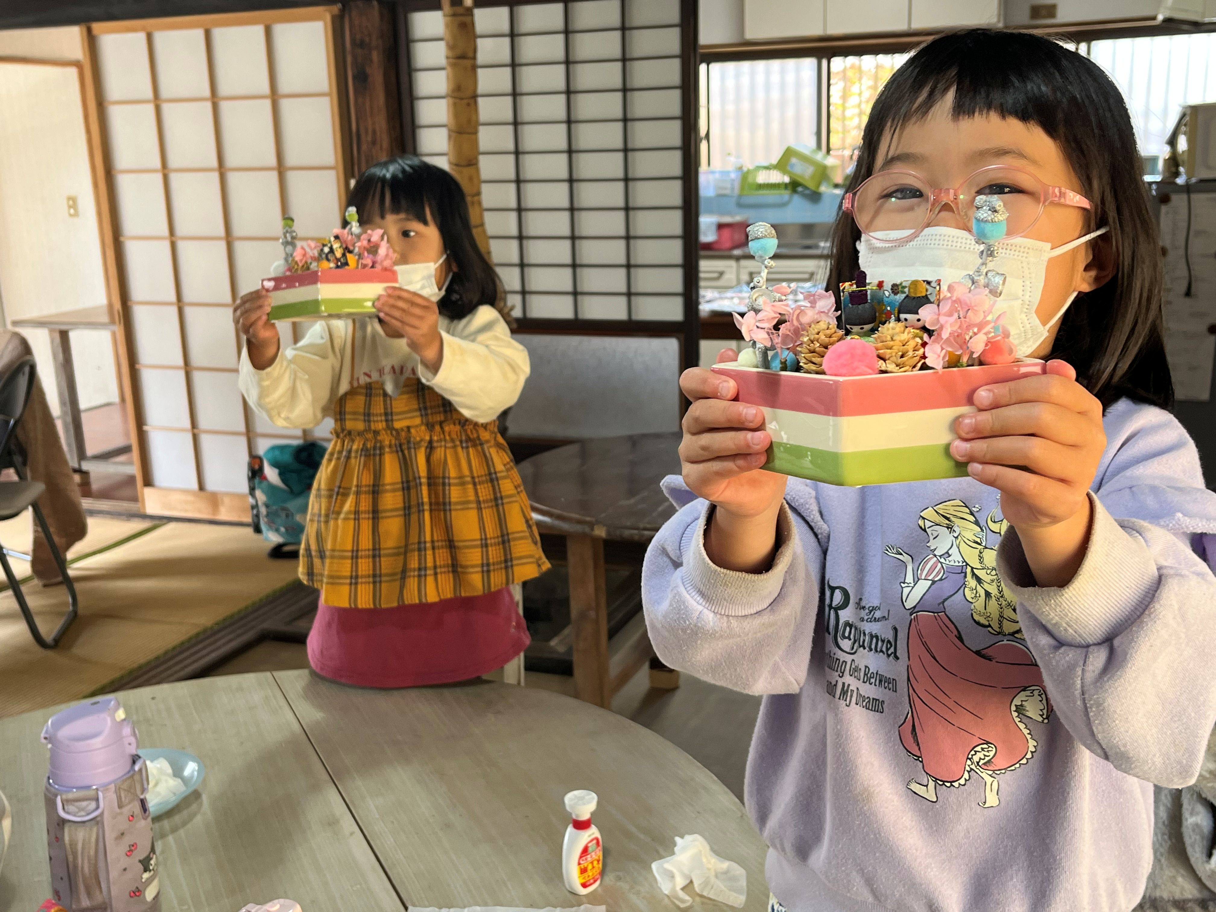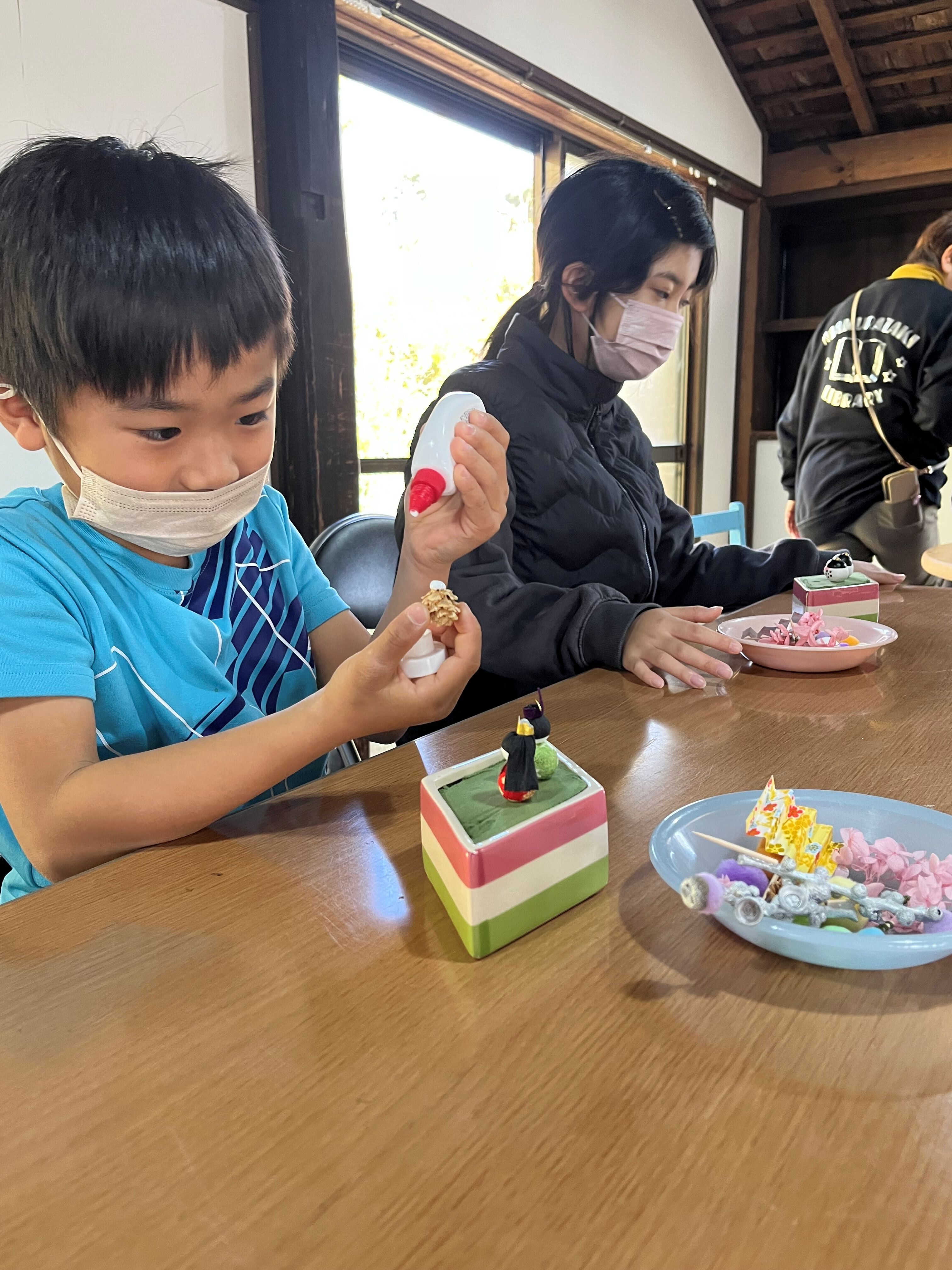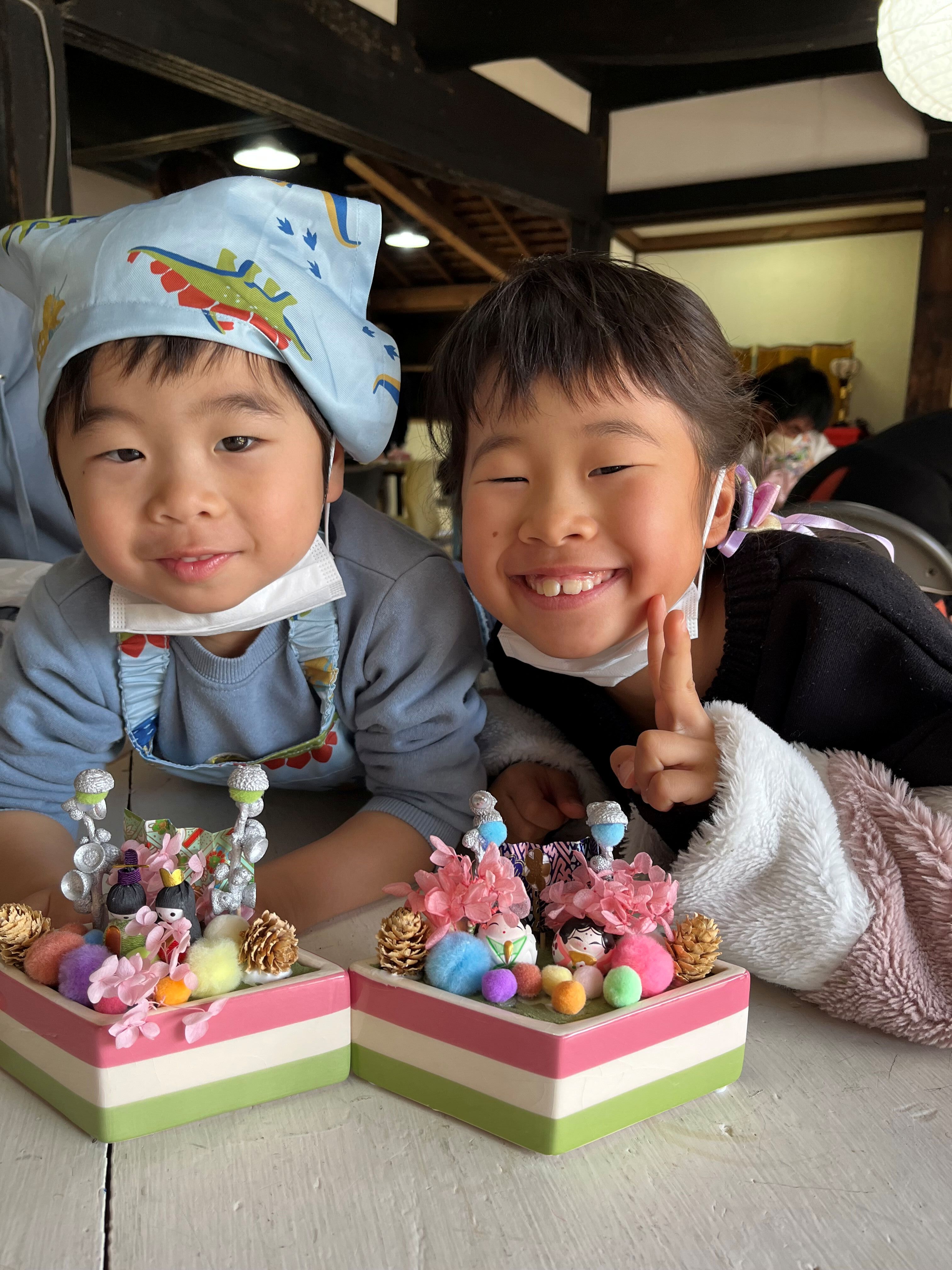 さくらもちの生地の材料を蒸している間におひなさま作りをしました。みんなとっても可愛らしいおひなさまが、出来上がりました!