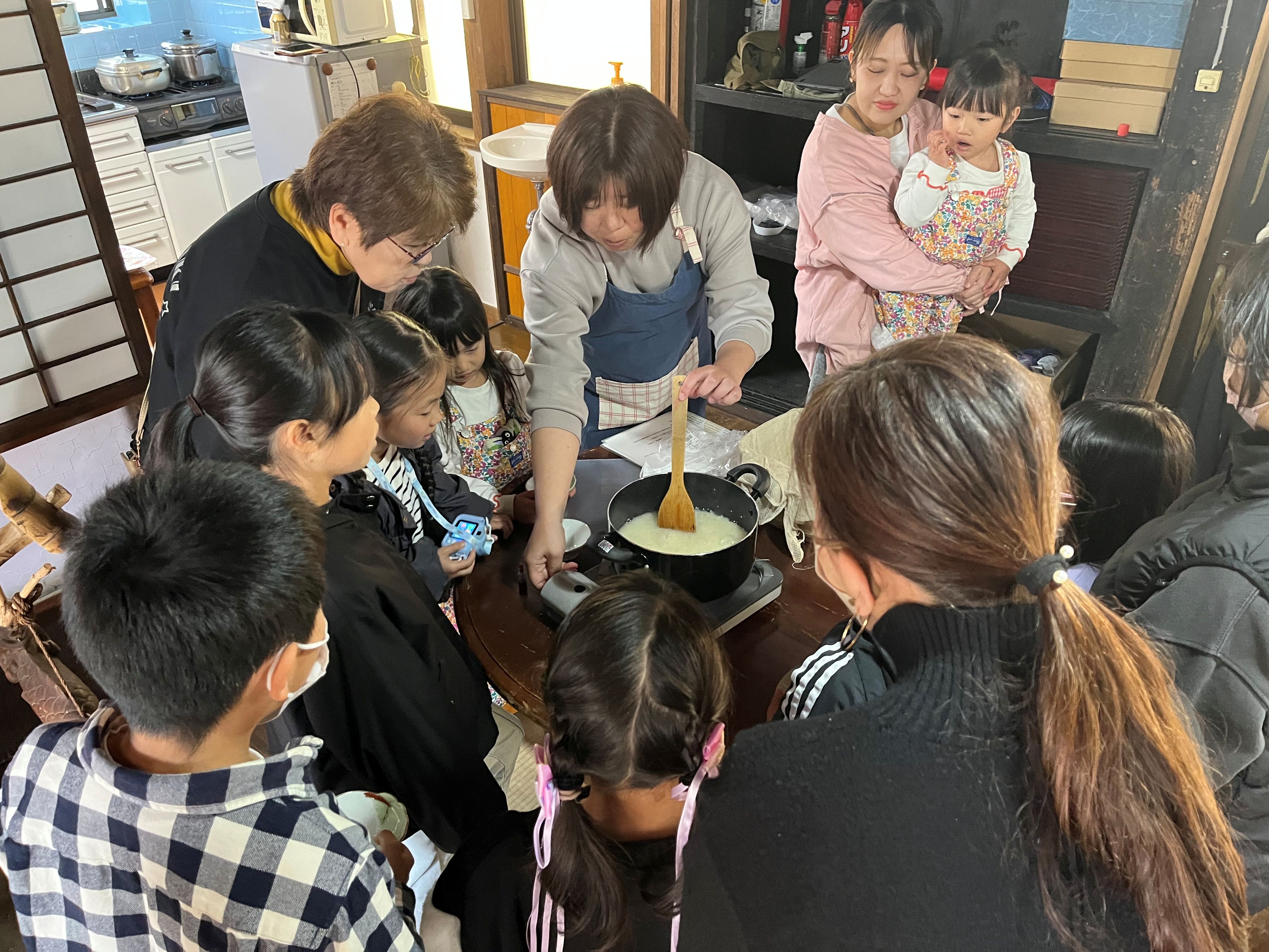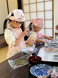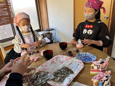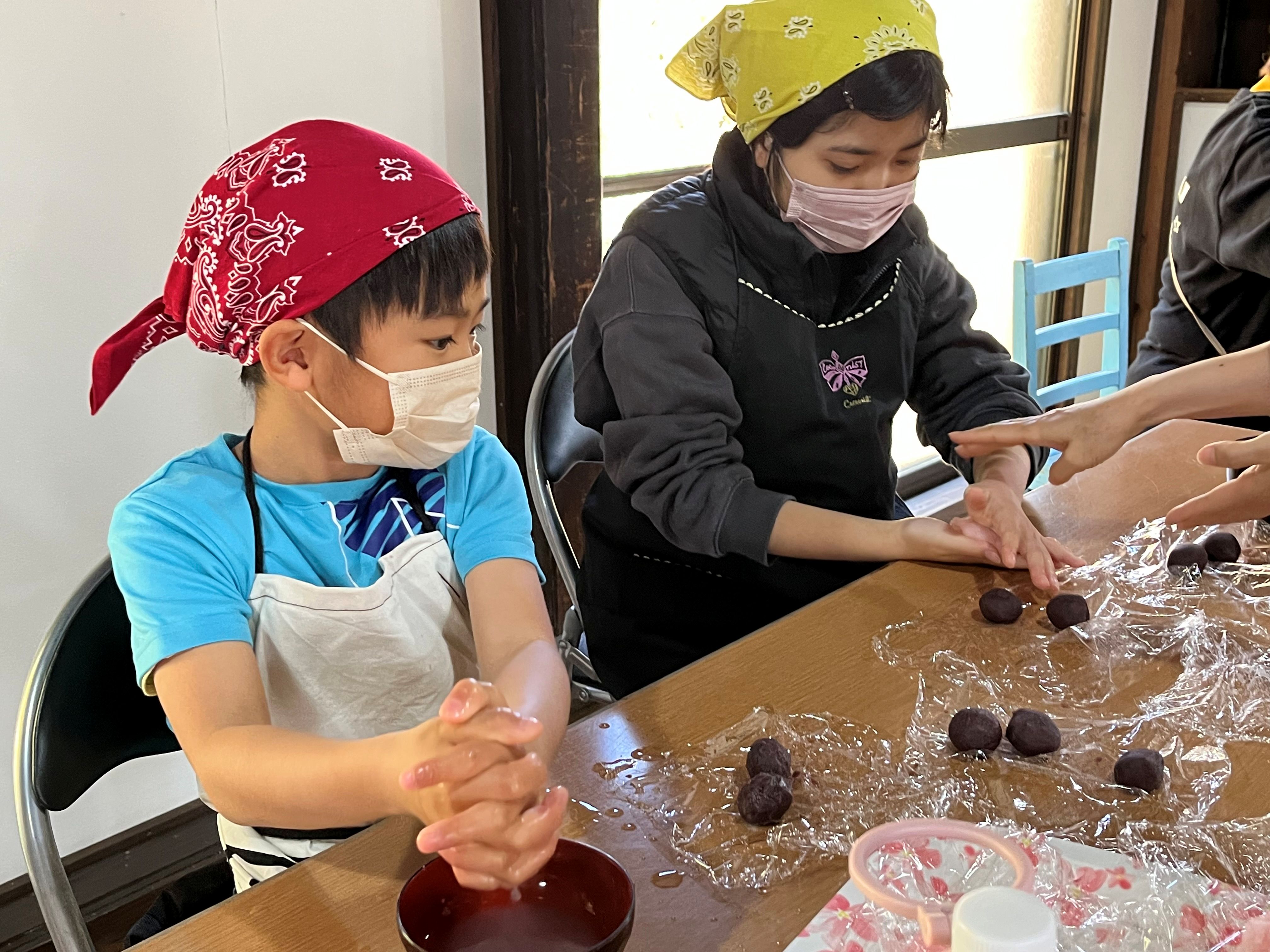 さくらもち作りでは、ピンク色に蒸しあがった生地をのばしたり、あんこを分けて生地で包んだり…親子で楽しく作りました。