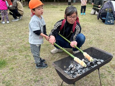 お父さん、お母さんたちと一緒に広場遊びや工作、くるくるパン焼き体験をしました(^^)